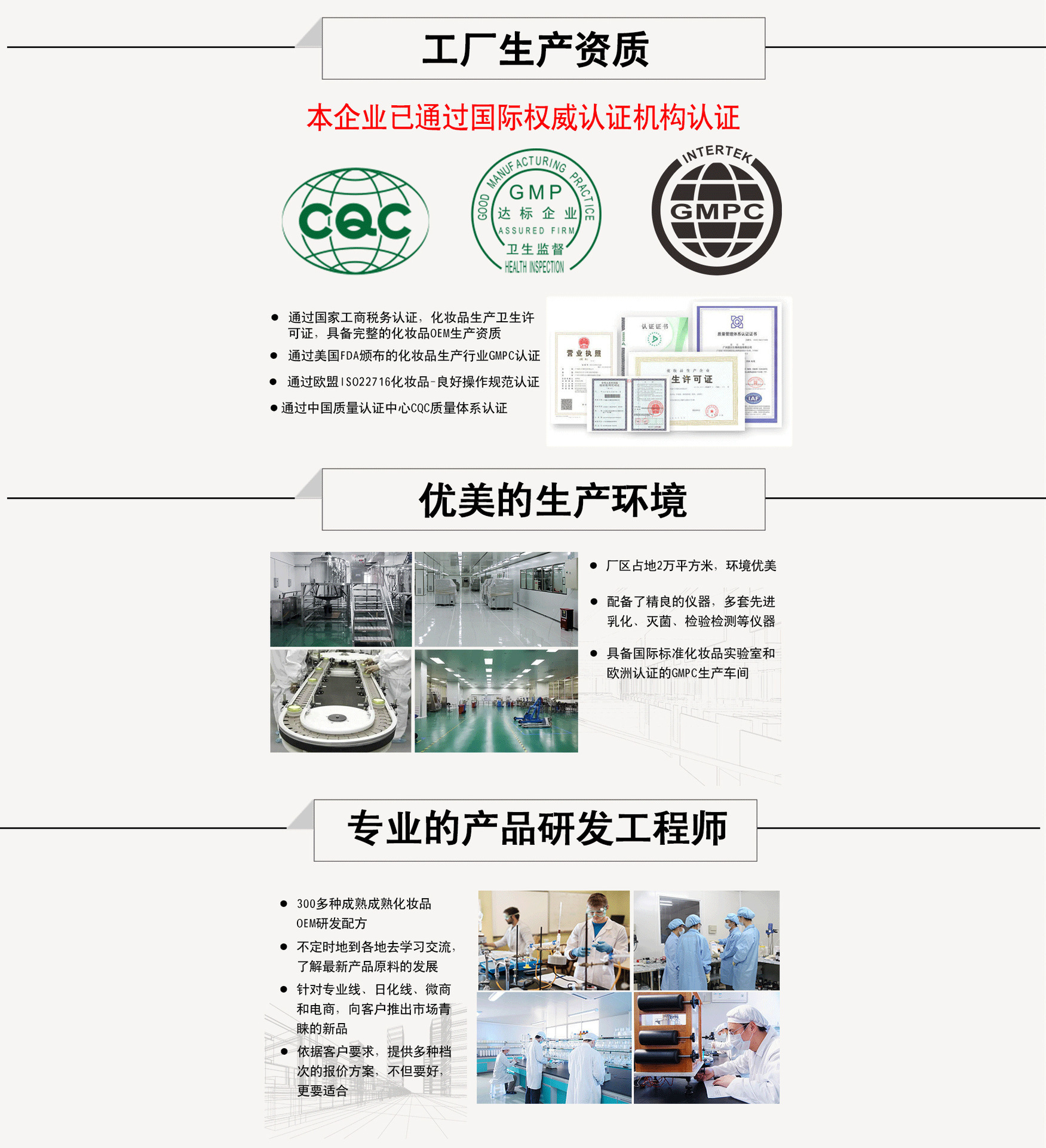 廣州市頂美化妝品有限公司,集科研、生產、營銷、服務、培訓于一體的專業日化企業,公司專注致力于健康美麗事業,以"打造民族品牌,為做強中國日化行業"為己任,不斷探索, 不斷努力,歷經十多年的發展,現已成為化妝品業界知名企業,旗下擁有伊億莉、伊麗萊及伊飄三大品牌。為了更好地應市場需求,伊億莉公司在努力完善市場機制的基礎上,憑著成熟穩定的技術配菌無塵車間,購置最先進國際標準制藥級(GMP)生產設施,年產值將逾3.2億,是國內化妝品代表性廠家之一。方及超前領先的經營理念,正營造更龐大的營銷體系,以品牌作為戰略延伸,確保產品品質穩定,按藥用產品生產標準,建設30萬級凈化GMP無