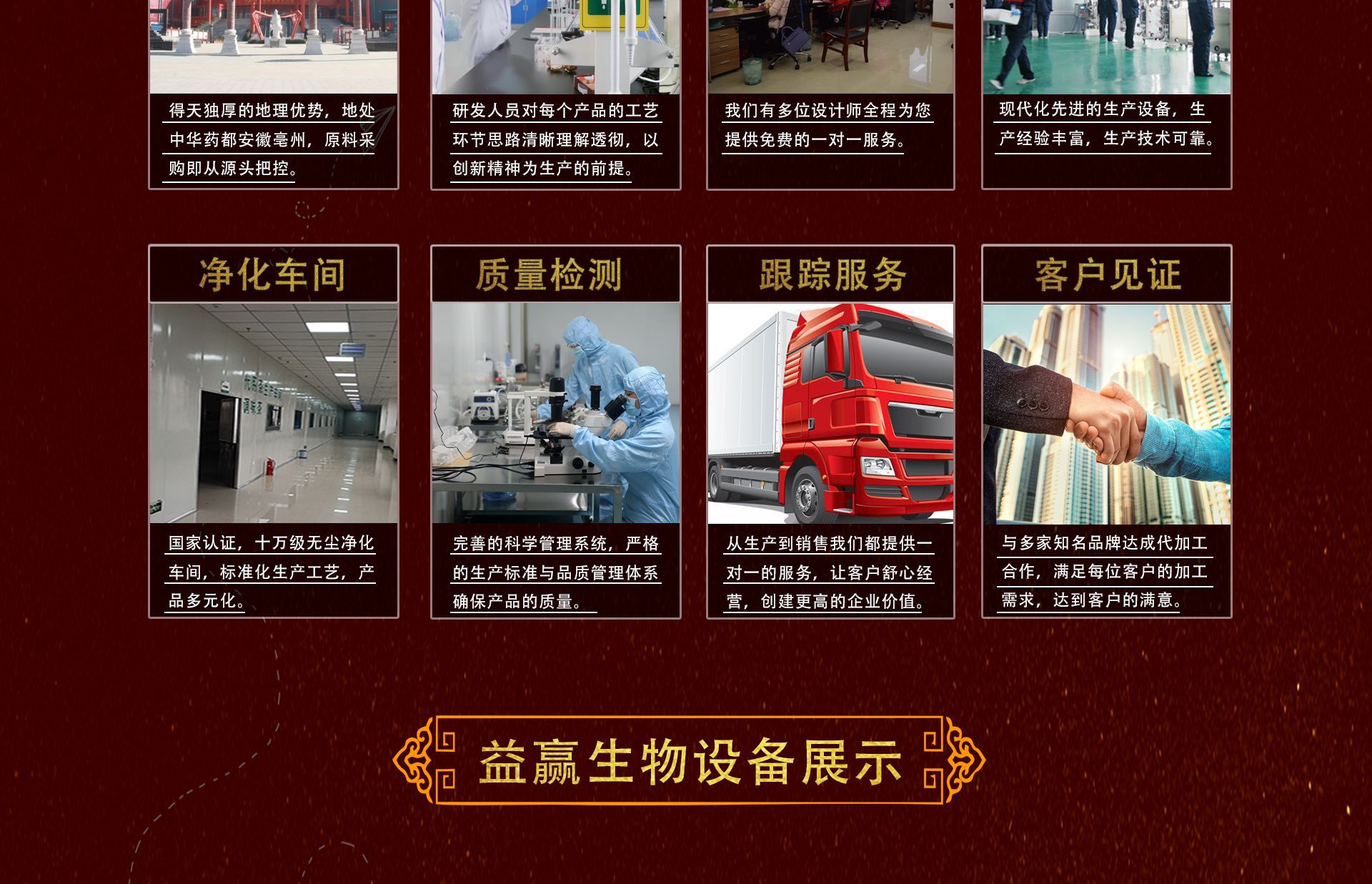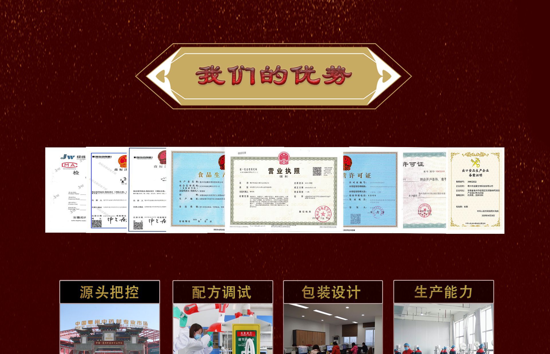 亳州市益贏生物科技有限公司,坐落于中國藥都故鄉---安徽亳州,益贏生物科技是一家集研發與生產為一體的OEM代加工生產企業,公司主要加工經營:代用茶、袋泡茶、組合花茶,調味茶、方便食品、代餐粉、膏滋、固體飲料、紅糖姜茶、各種顆粒固體飲料、花草茶、消毒產品、足浴包、足浴丸等產品,公司擁有完善科學的質量管理體系,為每一個產品的安全與質量保駕護航。亳州市益贏生物科技有限公司現有熟練包裝工人102人,高管5人,研發人員6人,質檢人員6人,公司秉承著:誠實守信、質量第一的經營理念,堅守著以實力發展的原則獲得業內和廣大新老客戶的認可與信賴。在此益贏生物科技有限公司熱烈歡迎各界新老朋友蒞臨參觀、指導和業務洽談!!!