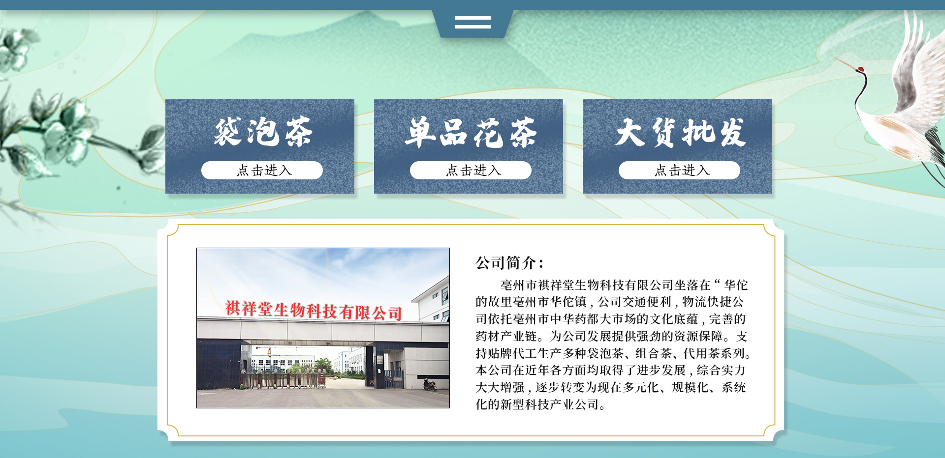 亳州市祺祥堂生物科技有限公司坐落在”神醫(yī)華佗的故里“——亳州市華佗鎮(zhèn)。是一家花茶產(chǎn)品專業(yè)生產(chǎn)加工的公司,擁有完整、科學(xué)的質(zhì)量管理體系。公司交通十分便利;公司離亳州北高速出口1.5公里。 公司依托亳州市中華藥都大市場的文化底蘊(yùn),完善的藥材產(chǎn)業(yè)鏈;為公司發(fā)展提供強(qiáng)勁的資源保障。 公司成立于2019年,廠房占地面積3000多平方米,擁有員工80余人,研發(fā)團(tuán)隊6人;廠區(qū)環(huán)境整潔優(yōu)美。公司在各方面均取得了進(jìn)步發(fā)展,綜合實(shí)力大大增強(qiáng),逐步轉(zhuǎn)變?yōu)楝F(xiàn)在多元化、規(guī)?;?、科學(xué)化、系統(tǒng)化的新型科技產(chǎn)業(yè)公司。 亳州市祺祥堂生物科技有限公司的誠信、實(shí)力和產(chǎn)品質(zhì)量獲得業(yè)界的認(rèn)可。歡迎各界朋友蒞臨參觀、指導(dǎo)和業(yè)務(wù)洽談。