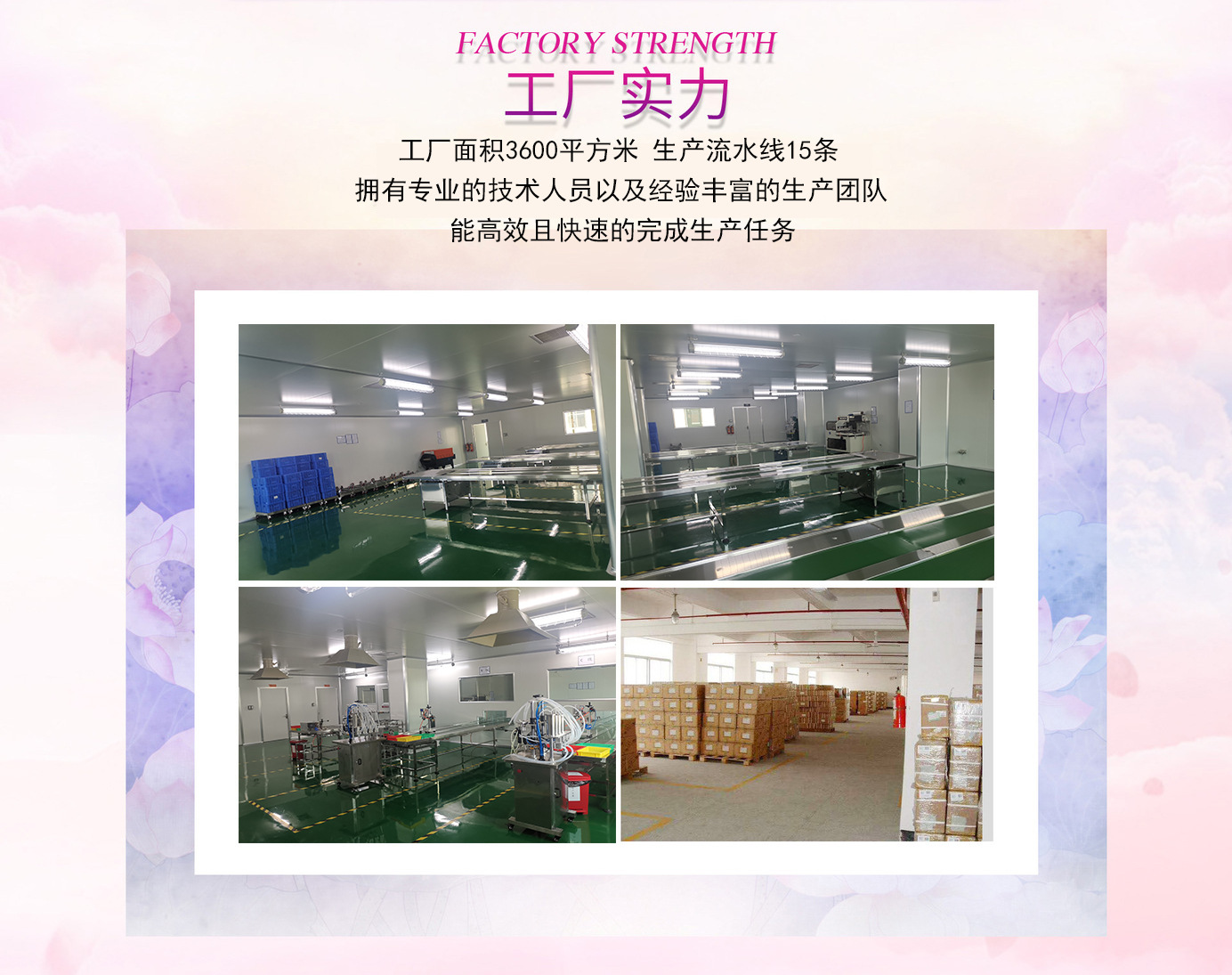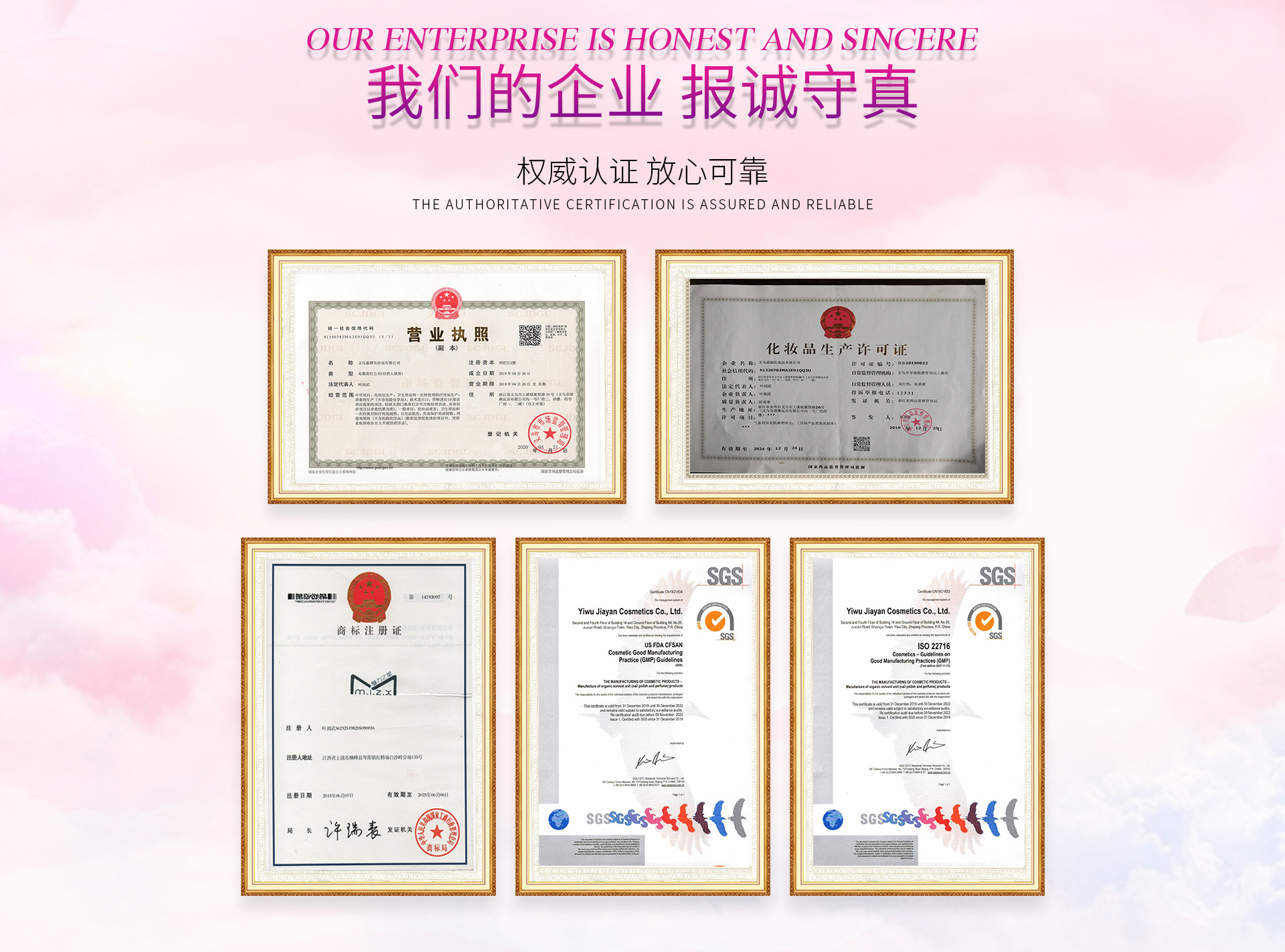 義烏嘉顏化妝品有限公司成立于2019年4月26日,注冊資本300萬,是一家集研發、生產、銷售、服務為一體的綜合性化妝品企業,主要從事免洗消毒液,免洗消毒凝膠,指甲油,香水,產品銷售。 公司一直以“質量第一,用戶至上”為使命,不斷創新、追求卓越。生產車間通過GSPC歐盟國際認證,SGS國際最高化妝品質量認證。公司一直以來都是秉承“顧客至上,質量為本”的核心理念,憑借高品質、高科技的優勢來研制新概念產品,呈現出青春、靚麗、高端國際化個性品牌。