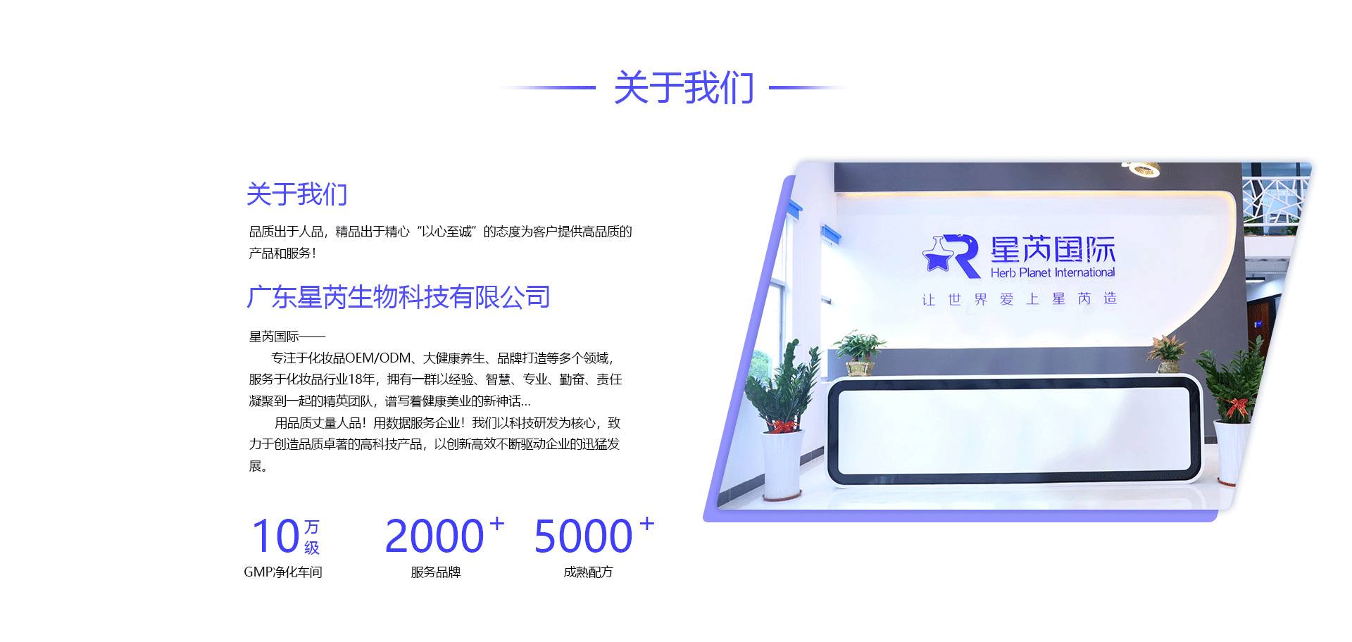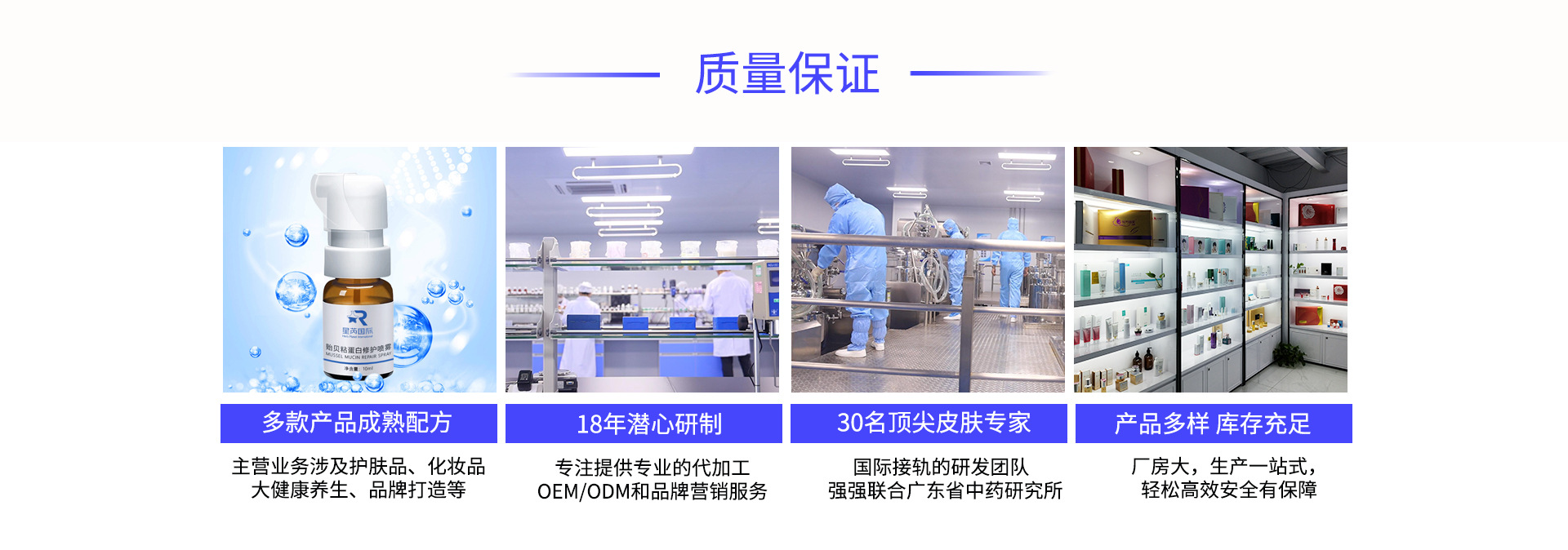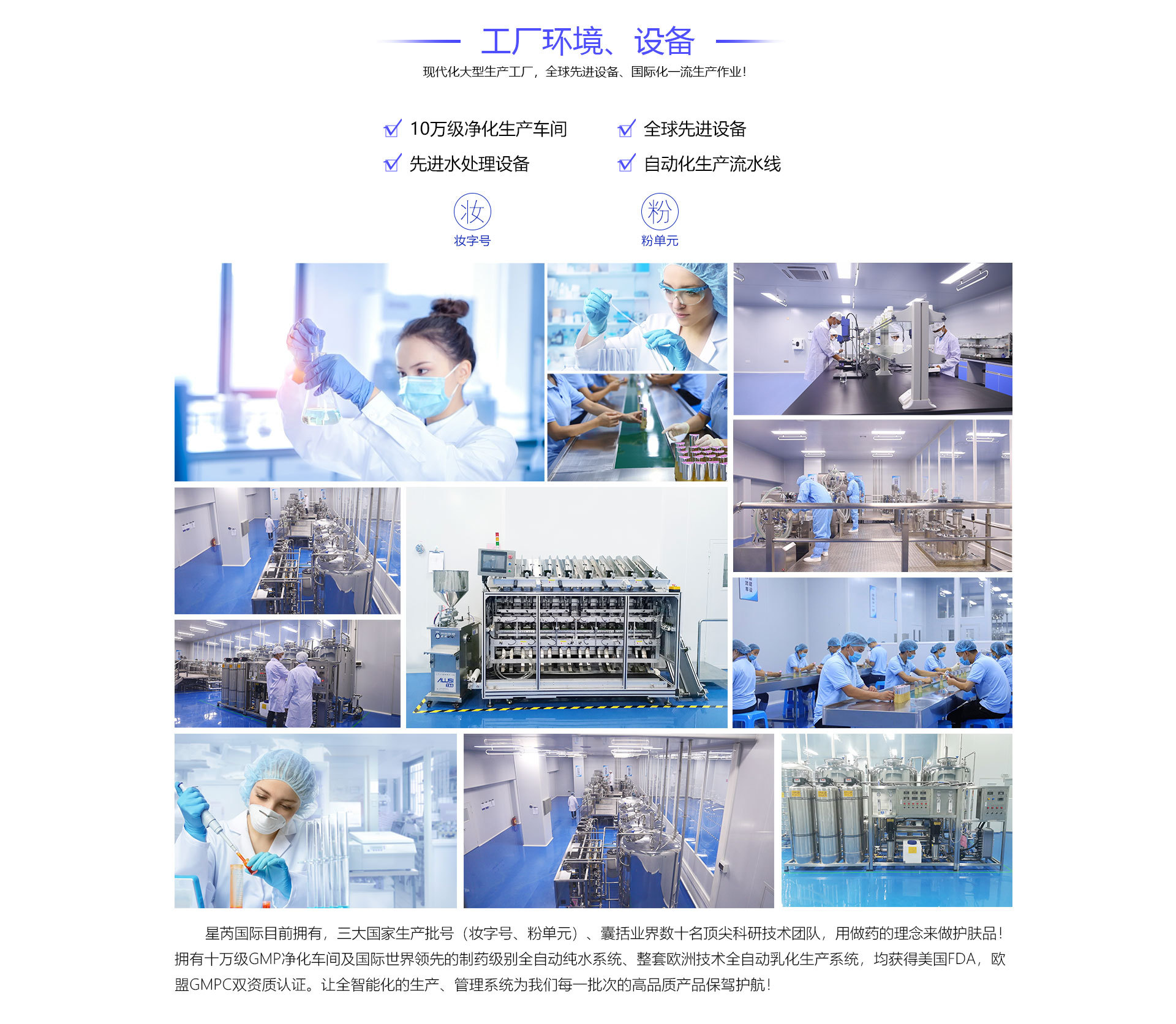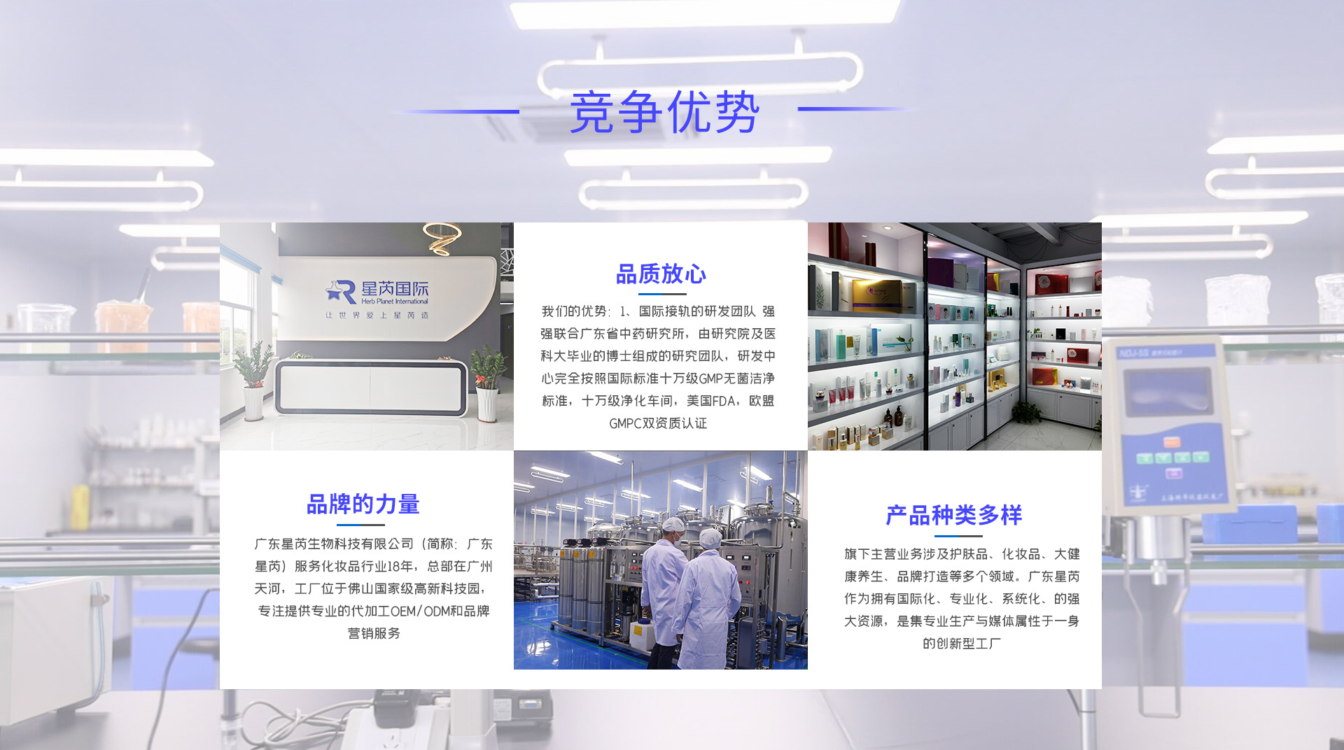 廣東星芮生物科技有限公司服務化妝品行業18年,總部在廣州天河,工廠位于佛山國家級高新科技園,專注提供專業的代加工OEM/ODM和品牌營銷服務,旗下主營業務涉及護膚品、化妝品、大健康養生、品牌打造等多個領域。廣東星芮作為擁有國際化、專業化、系統化、的強大資源,是集專業生產與媒體屬性于一身的創新型工廠。 公司所有產品均通過世界權威機構檢測及國家食品藥品監督管理局備案、安全有效,品質可靠有保障。品牌起步,新品開發,老品改造等系統化多方向的服務是我們獨有的優勢。