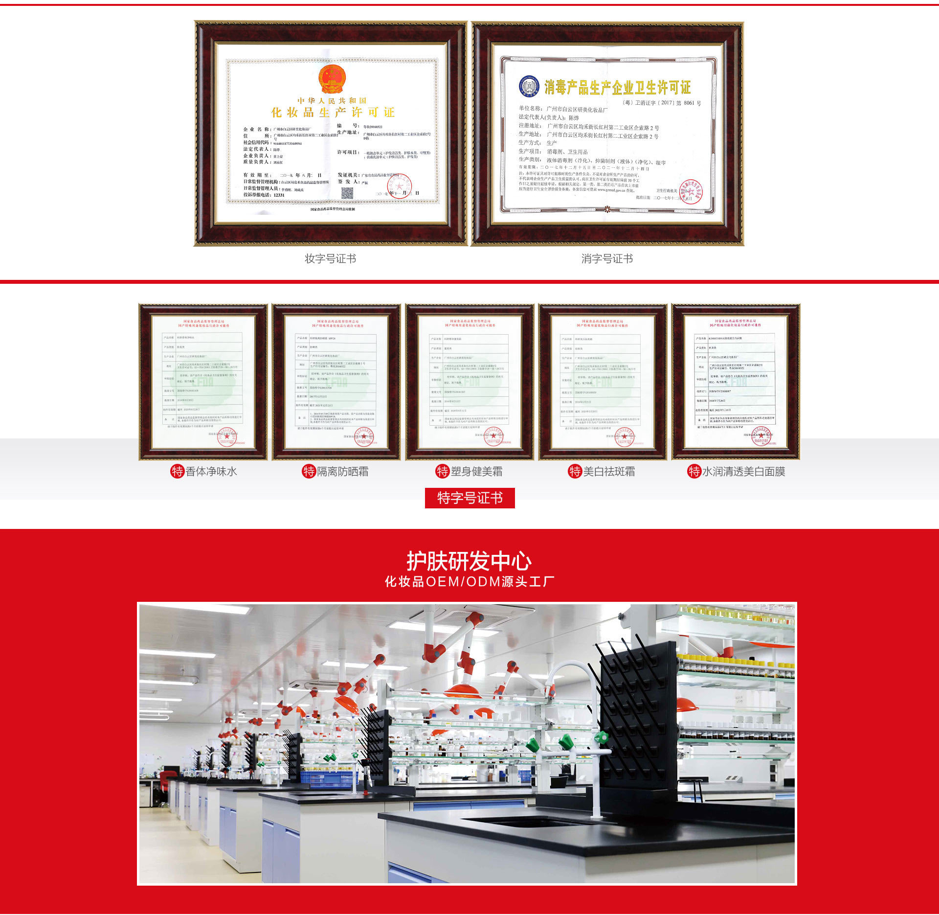 廣州宮妃生物科技有限公司是化妝品/護膚品/養生產品的專業生產加工工廠,擁有完整、科學的質量管理體系,是一家極富創新精神的加工(OEM/ODM)服務企業。 宮妃生物成立于2015年,坐落于廣州白云區雙和茶園崗;本著“以人為本,以精立業,以質取勝,以誠服務”的經營理念,以產品質量為企業發展之命脈,以市場為消費導向,以信譽為企業生存之根本,服務了眾多合伙伙伴! 宮妃生物擁有獨立化妝品生產廠房25000多平方米,擁有成功安全有效配方1000種,采用十萬級空氣凈化標準,現在總共有25條現代化的生產線,多套檢驗檢測設備,歡迎各位來廠實地考察,相信宮妃生物是您不二的合作伙伴之選!