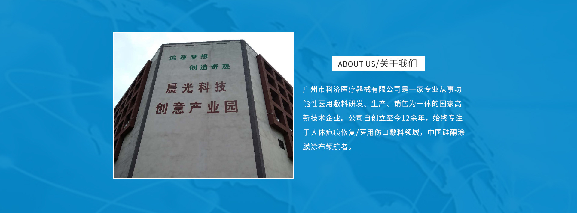 廣州市科濟醫療器械有限公司是一家專業從事功能性醫用敷料研發、生產、銷售為一體的國家高新技術企業。公司自創立至今12余年,始終專注于人體修復、人體皮膚修復、醫用傷口敷料領域?;诳蛻粜枨蟪掷m創新,不斷加強新技術研發和新材料應用,現已成為國內疤痕防治領域領航企業,國內皮膚創面修復護理整體方案供應商。我司生產基地位于廣州經濟技術開發區(西區),擁有符合SFDA標準以及ISO要求的品控體系。自2004年建立實驗室伊始,長期堅持研發投入,全系產品擁有完全自主知識產權,主要產品覆蓋全國80%的區縣以上醫療機構及醫保醫藥連鎖機構。 科濟人堅持走品牌化道路,以市場需求為導向,加強技術革新,嚴控品質監管;本著專注研發、助力醫療的企業宗旨,不忘初心,造福于民 ..