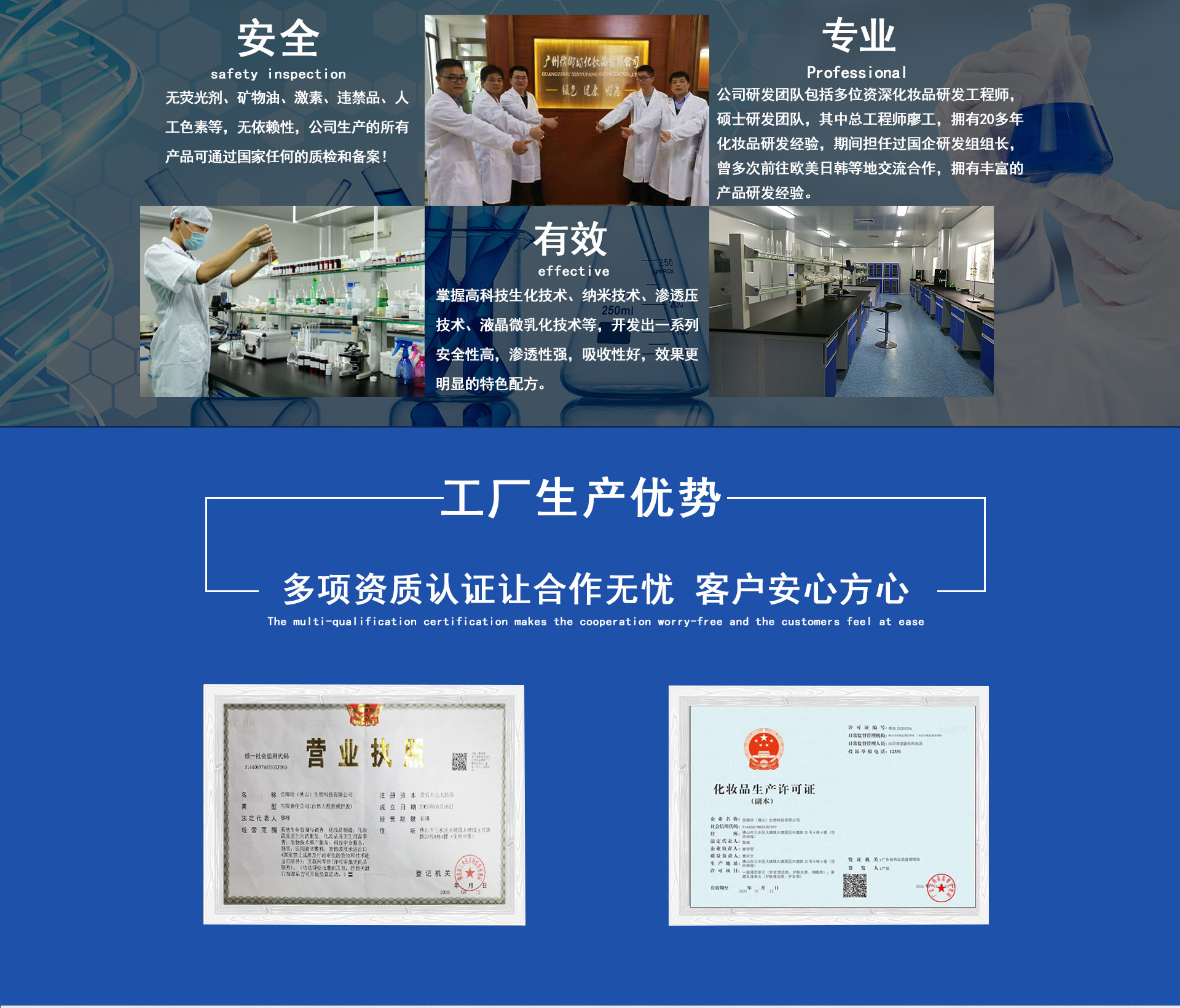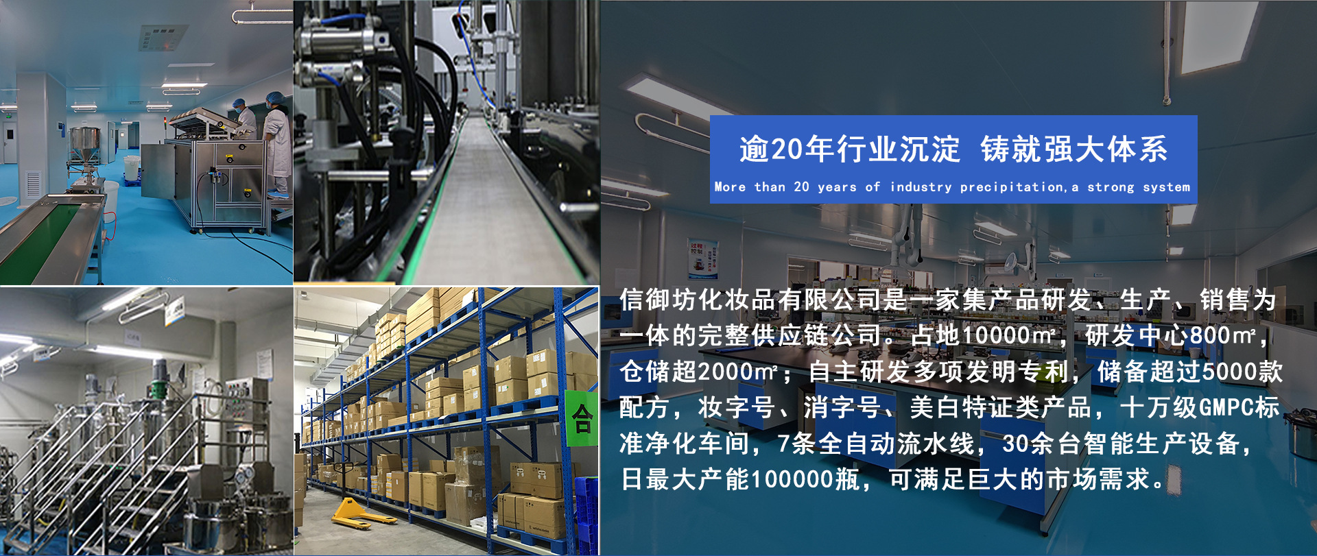 信御坊(佛山)生物科技有限公司是一家集科研、生產、銷售于一體的化妝品公司,始終堅持“質量至上、誠信為本、互惠共贏”的企業文化理念,針對國內大眾消費群體,研制國內性價比高的護膚品,公司擁有環保舒適的現代化生產車間,廠房面積10000平方米,員工100人,擁有3條真空均質乳化劑生產線,5條自動化流水生產線,建立了全封閉自動化管理輸送系統,實現了生產原材料到成品輸出的自動化,確保生產出高品質,精細化的產品。主要經營美容產品的加工貼牌,淡斑,祛痘,抗皺,修復,專業線護理等產品專業生產加工的公司,擁有完整、科學的質量管理體系。信御坊(佛山)生物科技有限公司的誠信、實力和產品質量獲得業界的認可。歡迎各界朋友蒞臨參觀、指導和業務洽談。