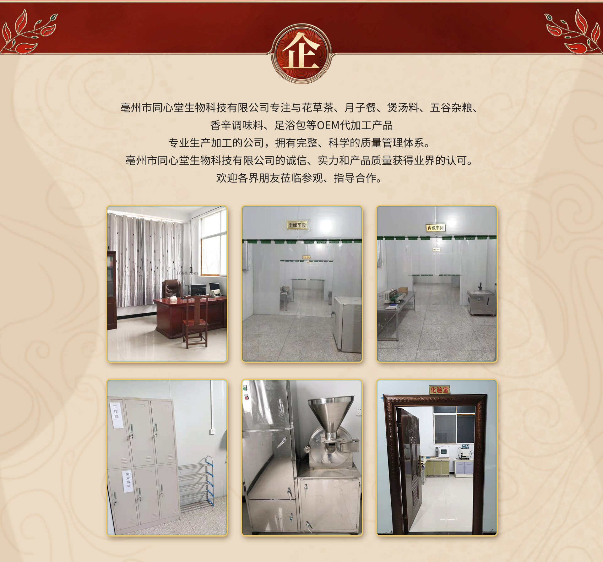 亳州市同心堂生物科技有限公司專注與花草茶、月子餐、煲湯料、五谷雜糧、香辛調味料、足浴包等OEM代加工產品,專業生產加工的公司,擁有完整、科學的質量管理體系。亳州市同心堂生物科技有限公司的誠信、實力和產品質量獲得業界的認可。歡迎各界朋友蒞臨參觀、指導合作。
