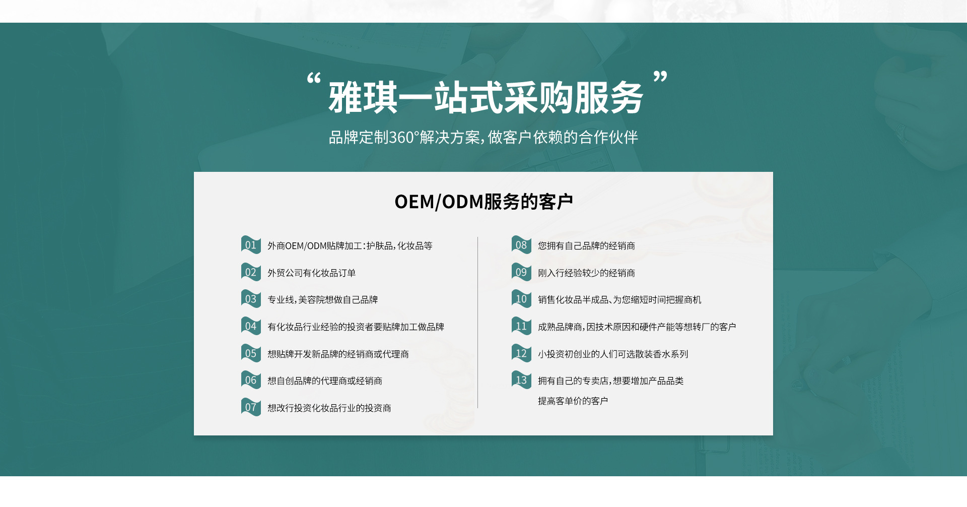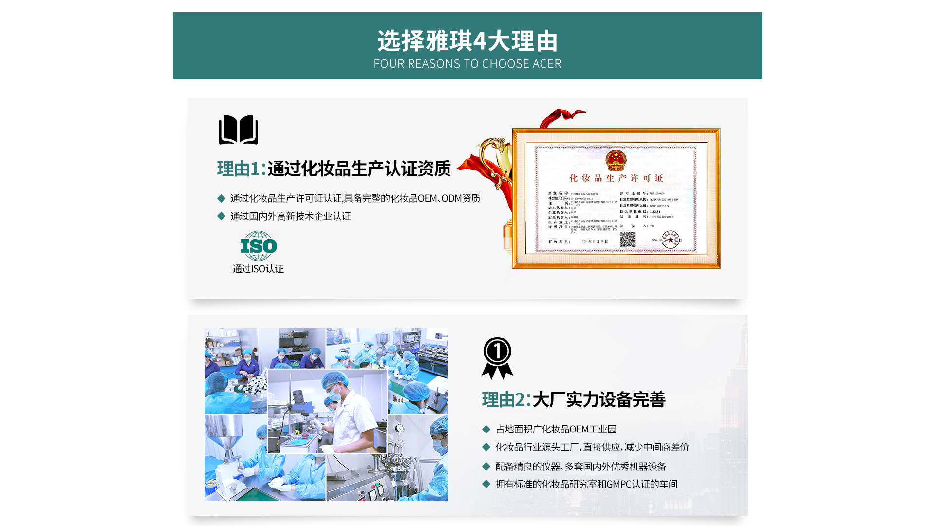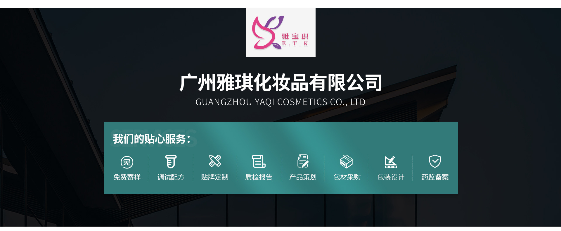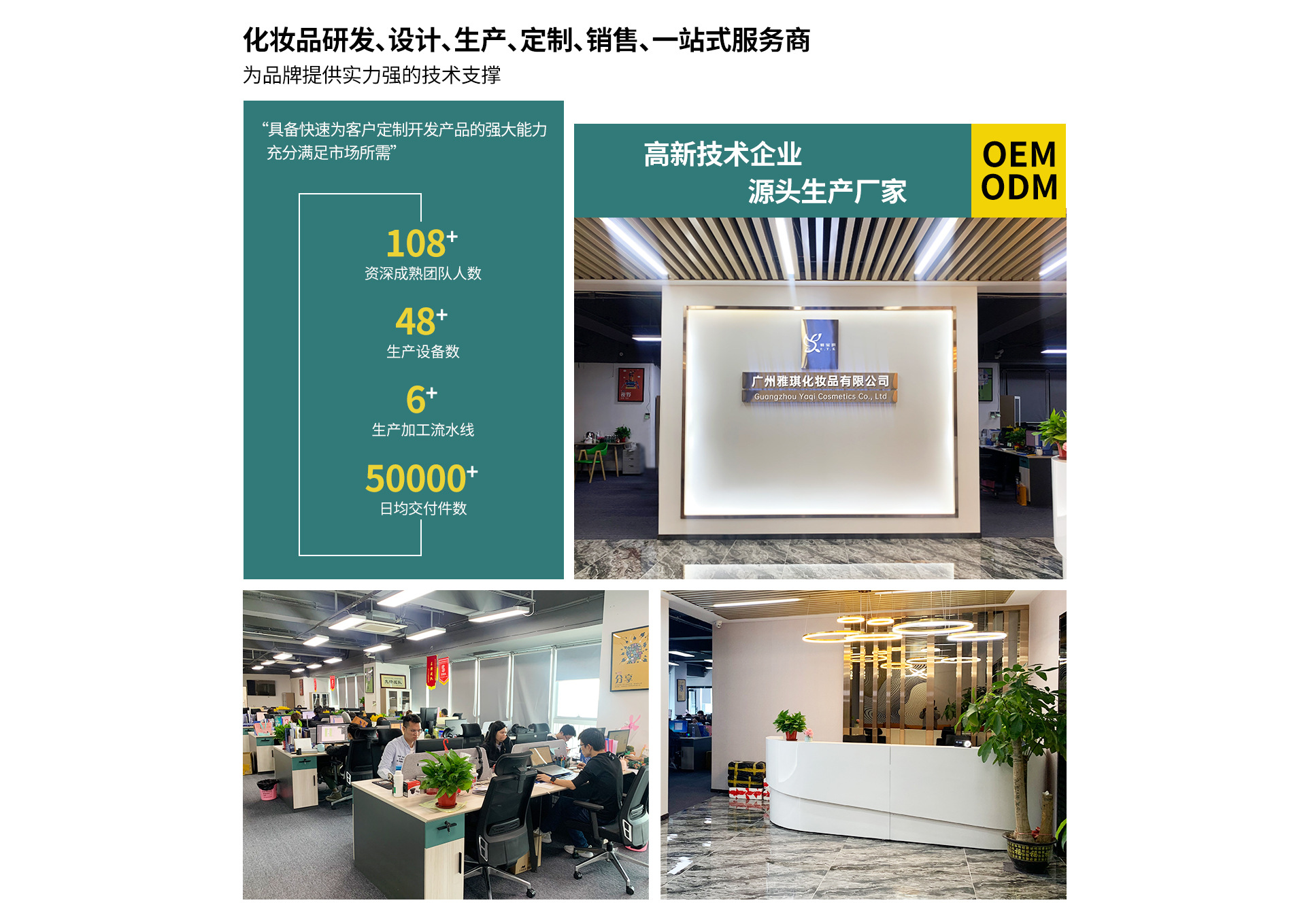 廣州雅琪化妝品有限公司成立于2018年,是一家集研發、生產、銷售于一體的專業護膚品化妝品生產加工企業,可來樣加工,主營化妝品套盒、水乳膏霜、精華液、婦科凝膠、精油等產品,遠銷海內外。2020年本公司增加了一類醫療器械生產線,各種貼類、凝膠類、敷料等均可生產。