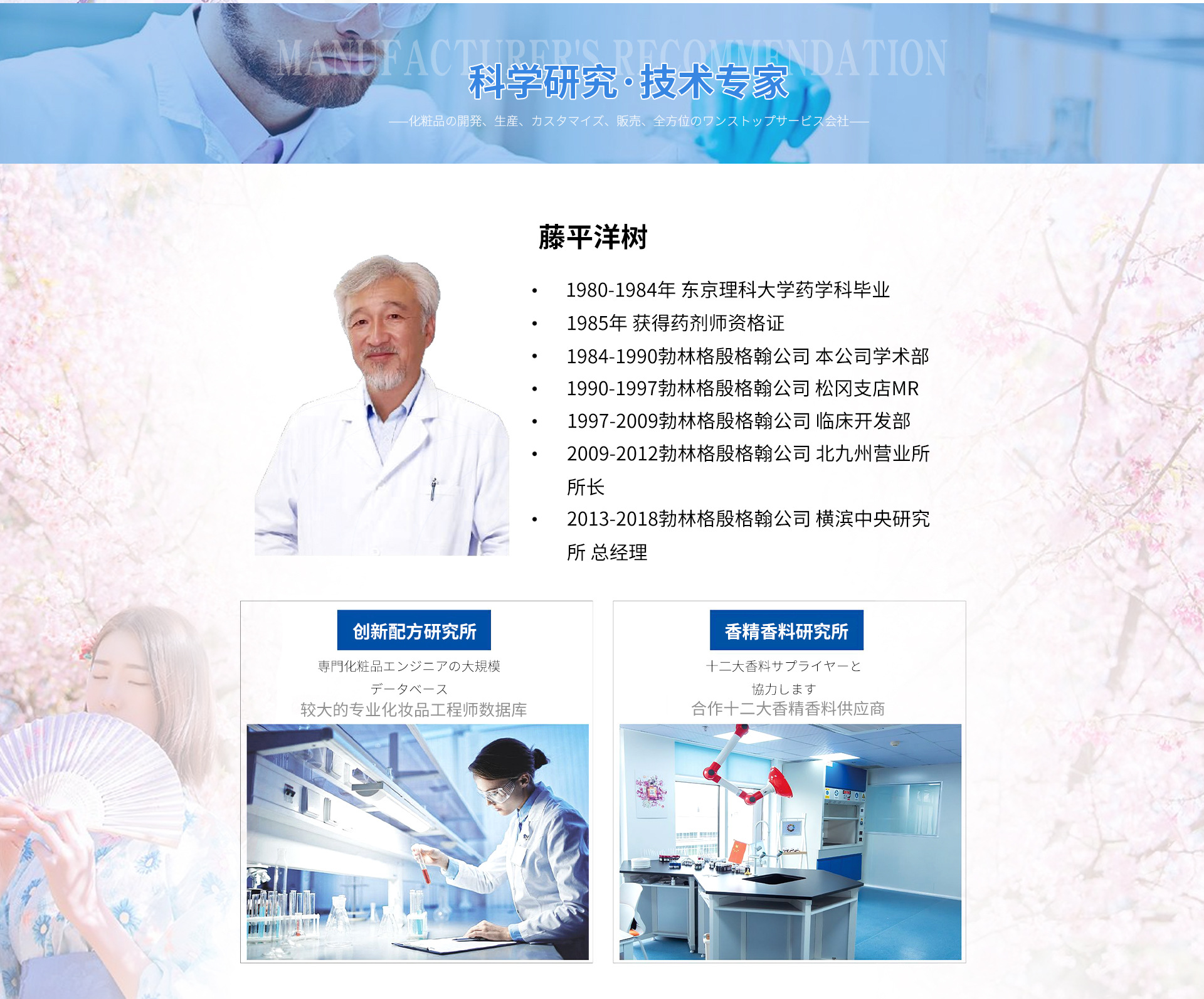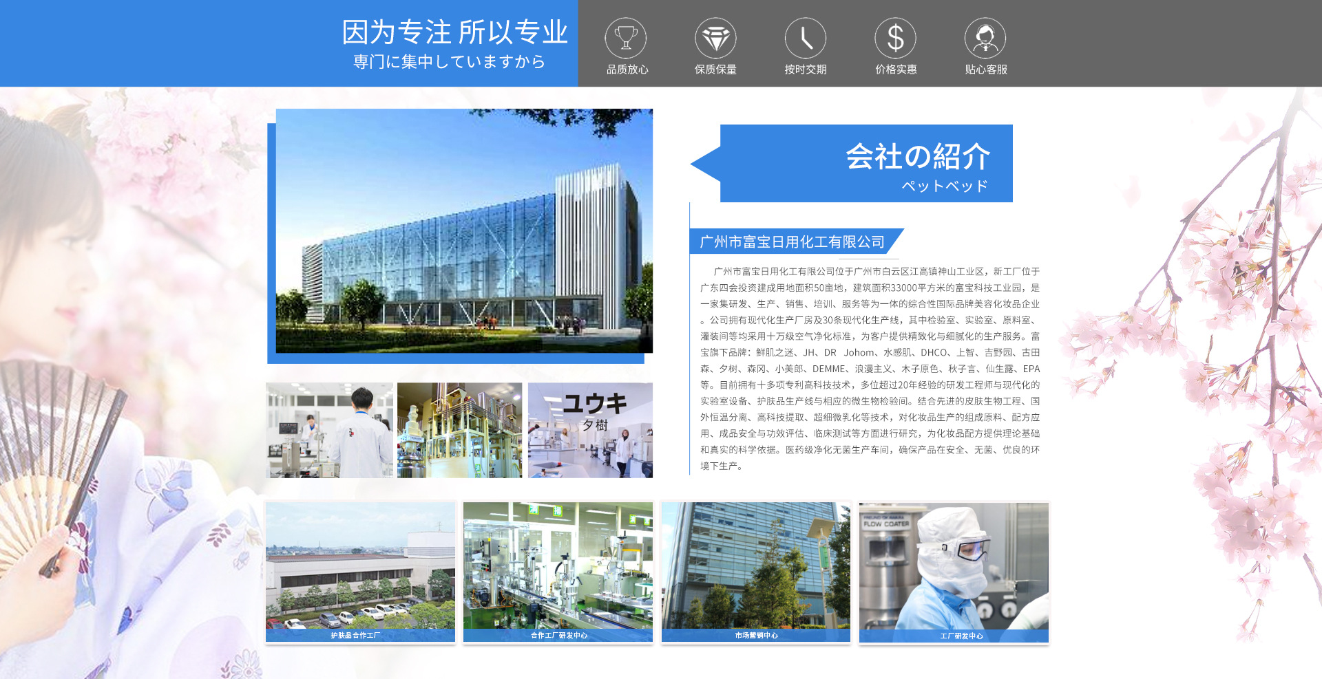 廣州市富寶日用化工有限公司位于廣州市白云區江高鎮神山工業區,新工廠位于廣東四會投資建成用地面積50畝地,建筑面積33000平方米的富寶科技工業園,是一家集研發、生產、銷售、培訓、服務等為一體的綜合性國際品牌美容化妝品企業。公司擁有現代化生產廠房及30條現代化生產線,其中檢驗室、實驗室、原料室、灌裝間等均采用十萬級空氣凈化標準,為客戶提供精致化與細膩化的生產服務。 目前擁有十多項專利高科技技術,多位超過20年經驗的研發工程師與現代化的實驗室設備、護膚品生產線與相應的微生物檢驗間。結合先進的皮膚生物工程、國外恒溫分離、高科技提取、超細微乳化等技術,對化妝品生產的組成原料、配方應用、成品安全與功效評估、臨床測試等方面進行研究,為化妝品配方提供理論基礎和真實的科學依據。醫藥級凈化無菌生產車間,確保產品在安全、無菌、優良的環境下生產。 富寶持續關注日本頂尖的生物技術與科技研發,以國際視野走在行業