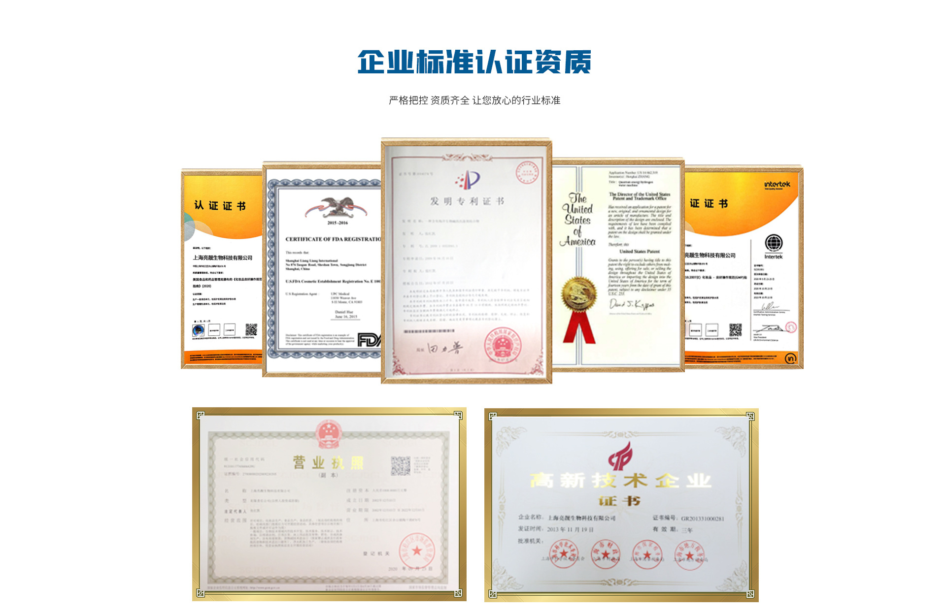 上海亮靚生物科技有限公司是2002年成立的高新技術企業,位于上海市松江佘山工業區,總建筑面積10600平方米,是國際細胞康復協會在中國的指定研發和生產基地,是聯合國衛生組織的響應者和創造人類健康細胞修復基因的國際性學術組織。公司旗下擁有自主品牌經營、自主出口銷售經營權、十萬級無塵車間、GMP認證廠房、1萬級潔凈度標準的研發中心、國家ISO 9001質量管理體系。 我們與首席科學家張紅凱博士聯合美國細胞康復協會長期合作,秉承不斷推陳創新的態度研發出了產品納米凍干閃釋片系列產品,榮獲美國發明專利、美國FDA認證。