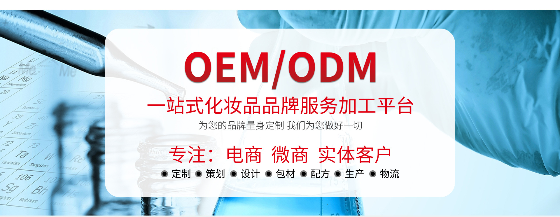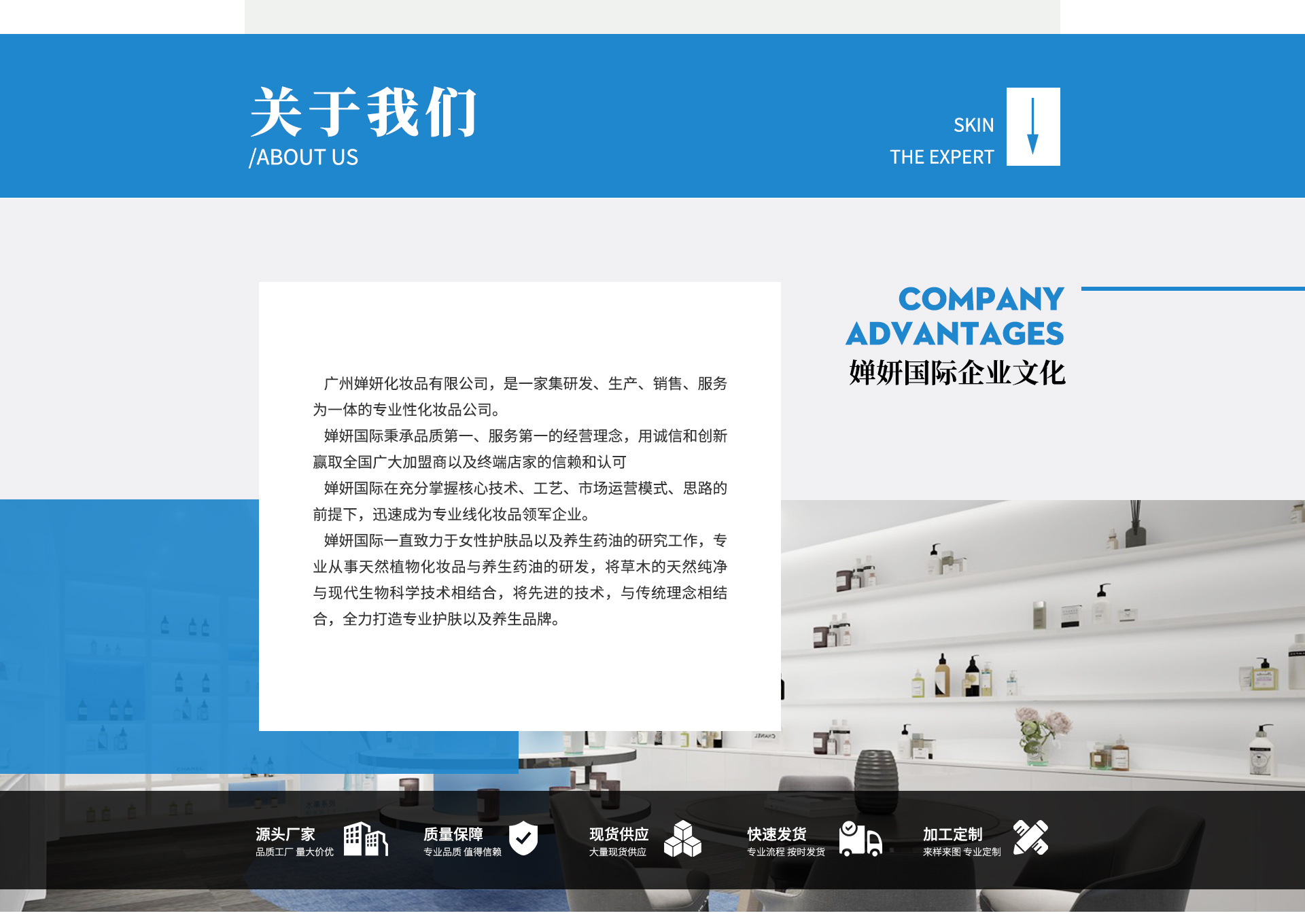廣州嬋妍化妝品有限公司,是一家集研發、生產、銷售、服務為一體的專業性化妝品公司。自2009年至今已有12個年頭,并且創建了廣州嬋妍生物科技有限公司。 廣州嬋妍化妝品有限公司秉承品質第一、服務第一的經營理念,用誠信和創新贏取全國廣大代加工、加盟商以及終端店家的信賴和認可 廣州嬋妍化妝品有限公司在充分掌握核心技術、工藝、市場運營模式、思路的前提下,迅速成為專業線化妝品領軍企業。 廣州嬋妍化妝品有限公司一直致力于女性護膚品以及養生藥油的研究工作,專業從事天然植物化妝品與養生藥油的研發,將草木的天然純凈與現代生物科學技術相結合,將先進的技術,與傳統理念相結合,全力打造專業護膚以及養生品牌。 廣州嬋妍化妝品有限公司旗下品牌 線下專業線品牌:夢麗媛、嬌云慕、仙詩華、米莉姿。 (專業售后老師、專業講師、專業實操老師一對一下市場指導) 線上爆品品牌:慕芳華 (線上教學,直播帶貨)