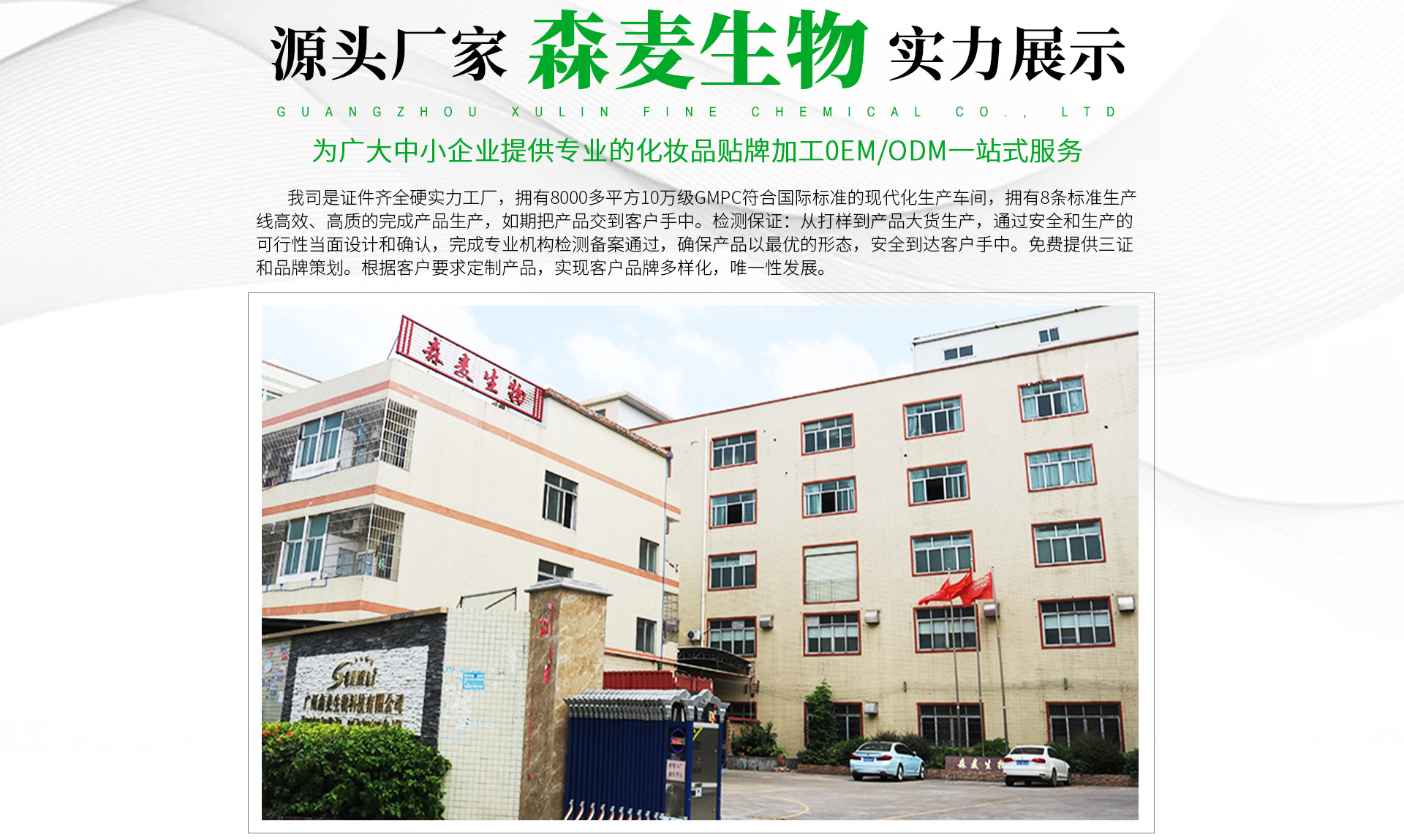 森麥化妝品加工廠憑借優(yōu)質(zhì)的產(chǎn)品,卓越的功效、專業(yè)的服務(wù)水準(zhǔn),在行業(yè)內(nèi)贏得國內(nèi)客戶的普遍尊重。公司已經(jīng)與多家國內(nèi)數(shù)十家知名專業(yè)、日化企業(yè)建立了合作關(guān)系,是業(yè)界功效型產(chǎn)品:祛皺祛斑祛痘美白、面膜、貼片系列專業(yè)的OEM/ODM專業(yè)服務(wù)企業(yè)之一。 擁有8000多平方10萬級GMPC符合國際標(biāo)準(zhǔn)的現(xiàn)代化生產(chǎn)車間.具備孕童產(chǎn)品和眼部特護生產(chǎn)資質(zhì),公司以優(yōu)異的產(chǎn)品質(zhì)量、簡捷明快的產(chǎn)品形象深受消費者喜愛,特別是其產(chǎn)品結(jié)構(gòu)豐富,產(chǎn)品使用效果獨特,并以其獨特的設(shè)計風(fēng)格,深受消費者熱捧,并受到國際化妝品界的高度關(guān)注,公司與國內(nèi)企業(yè)強強結(jié)合,共同投資研發(fā)、共同享受科技成果,確保公司產(chǎn)品、快速、安全,質(zhì)量達(dá)到國際先進水平。 產(chǎn)品加工和服務(wù)項目:美白、祛斑、祛痘、祛皺及水晶膜貼系列、無紡布面膜系列、養(yǎng)生和其它貼系列。產(chǎn)品從質(zhì)量、款式均在同行之首,而且手續(xù)齊全。開發(fā)能力強,技術(shù)成熟,產(chǎn)品品種款式多樣,面