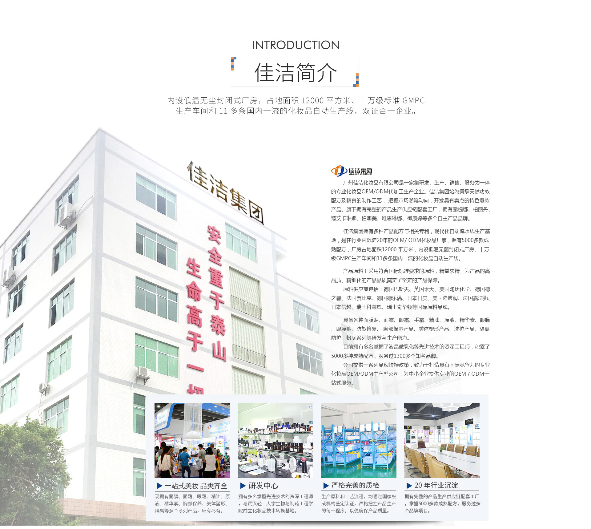 廣州佳潔化妝品有限公司是一家集研發、生產及銷售為一體的專業化妝品OEM/ODM加工企業,坐落于廣州白云區。主要從事精油、化妝品、護膚品、面膜、原液、膏霜、等化妝品代加工、精油代加工、護膚品代加工、以及化妝品原料等產品專業生產加工與銷售的公司