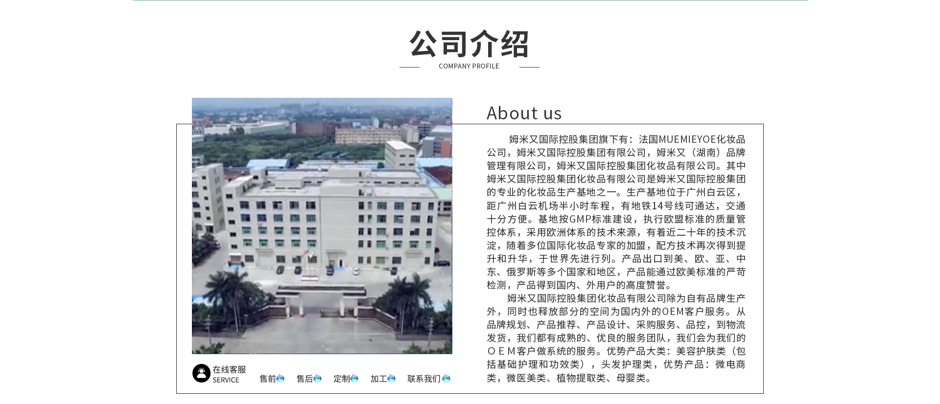 姆米又國際控股集團旗下有:法國MUEMIEYOE化妝品公司,姆米又國際控股集團有限公司,姆米又(湖南)品牌管理有限公司,姆米又國際控股集團化妝品有限公司。其中姆米又國際控股集團化妝品有限公司是姆米又國際控股集團的專業的化妝品生產基地之一。 生產基地位于廣州白云區,距廣州白云機場半小時車程,有地鐵14號線可通達,交通十分方便。基地完全按GMP標準建設,執行歐盟標準的質量管控體系,采用歐洲體系的技術來源,有著近二十年的技術沉淀,隨著多位國際化妝品專家的加盟,配方技術再次得到提升和升華,引領于世界先進行列。產品出口到美、歐、亞、中東、俄羅斯等多個國家和地區,產品完全能通過歐美標準的嚴苛檢測,產品得到國內、外用戶的高度贊譽。 姆米又國際控股集團化妝品有限公司除為自有品牌生產外,同時也釋放一定的空間為國內外的OEM客戶服務。從品牌規劃、產品推薦、產品設計、采購服務、品控,到物流發貨,我們都有成熟的