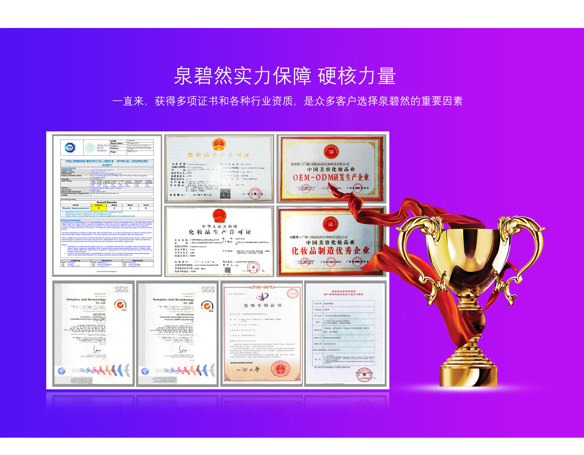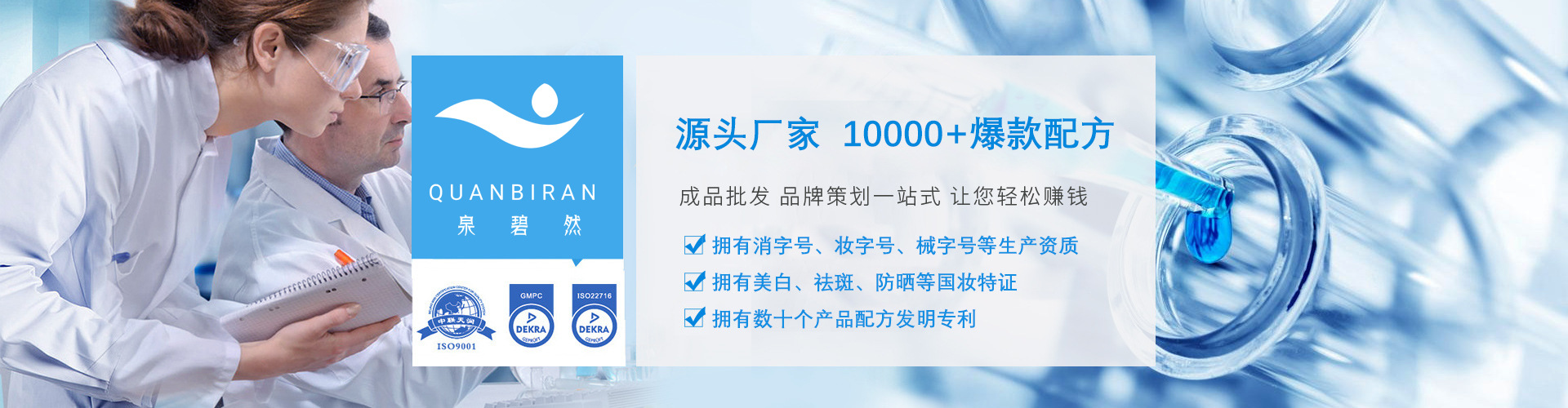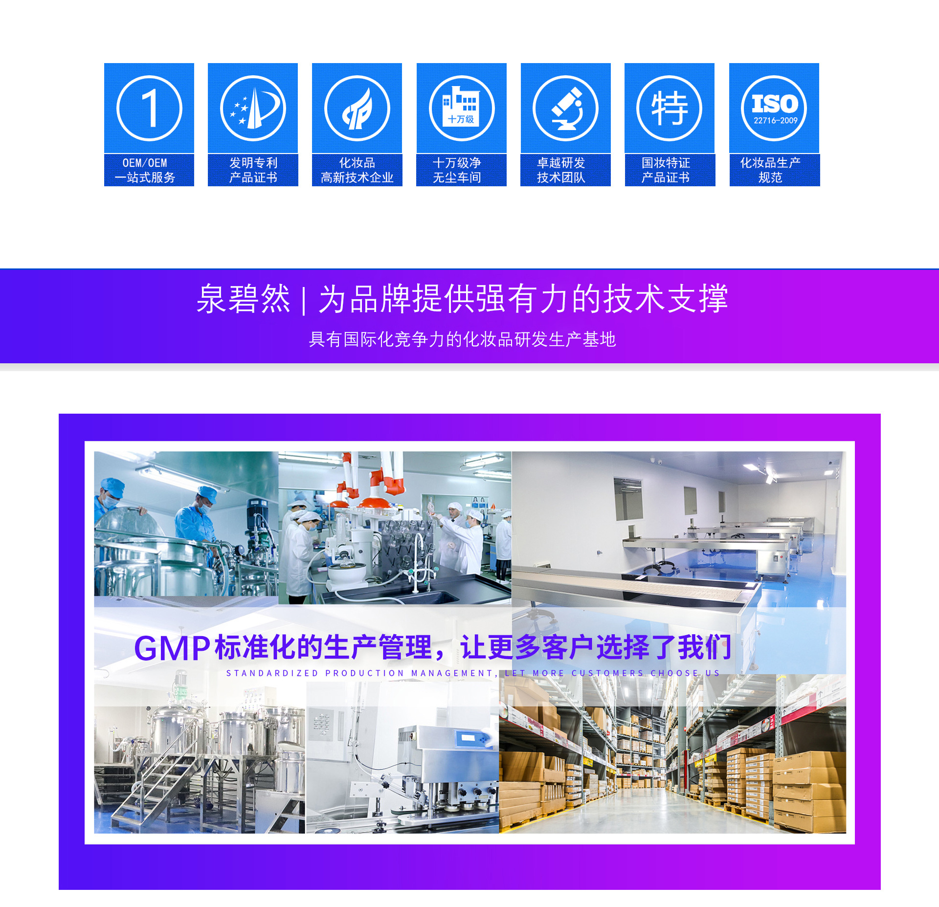 泉碧然(廣州)國際醫藥生物科技有限公司是一家融匯生物科技研發、生產制造、技術服務于一體的美容化妝品OEM/ODM/OBM現代化綜合企業,公司采用國內外先進的研發技術,啟用業界先進的管理系統,匯聚眾多國內外同行業科研技術精英,配置高端先進的生產流水線,公司以全新的經營理念為導向,以高科技為核心。以先進的設備為基礎,以優良的研發團隊為支柱,精心打造化妝品行業OEM龍頭企業,做適合各類肌膚適應的化妝品研發、生產、銷售的高端企業。涉及各類功效型護膚品,養生私護等系列產品,采用國內外高端進口原材料,研發新品,調配出您滿意的產品。公司位于廣州市白云區,占地面積約10000平方米, 并擁有十萬級GMP孵化灌裝車間和多個國際標準化的生產車間,具備消字號、妝字號、械字號等生產資質,擁有完整、科學的質量管理體系,能夠用最短的時