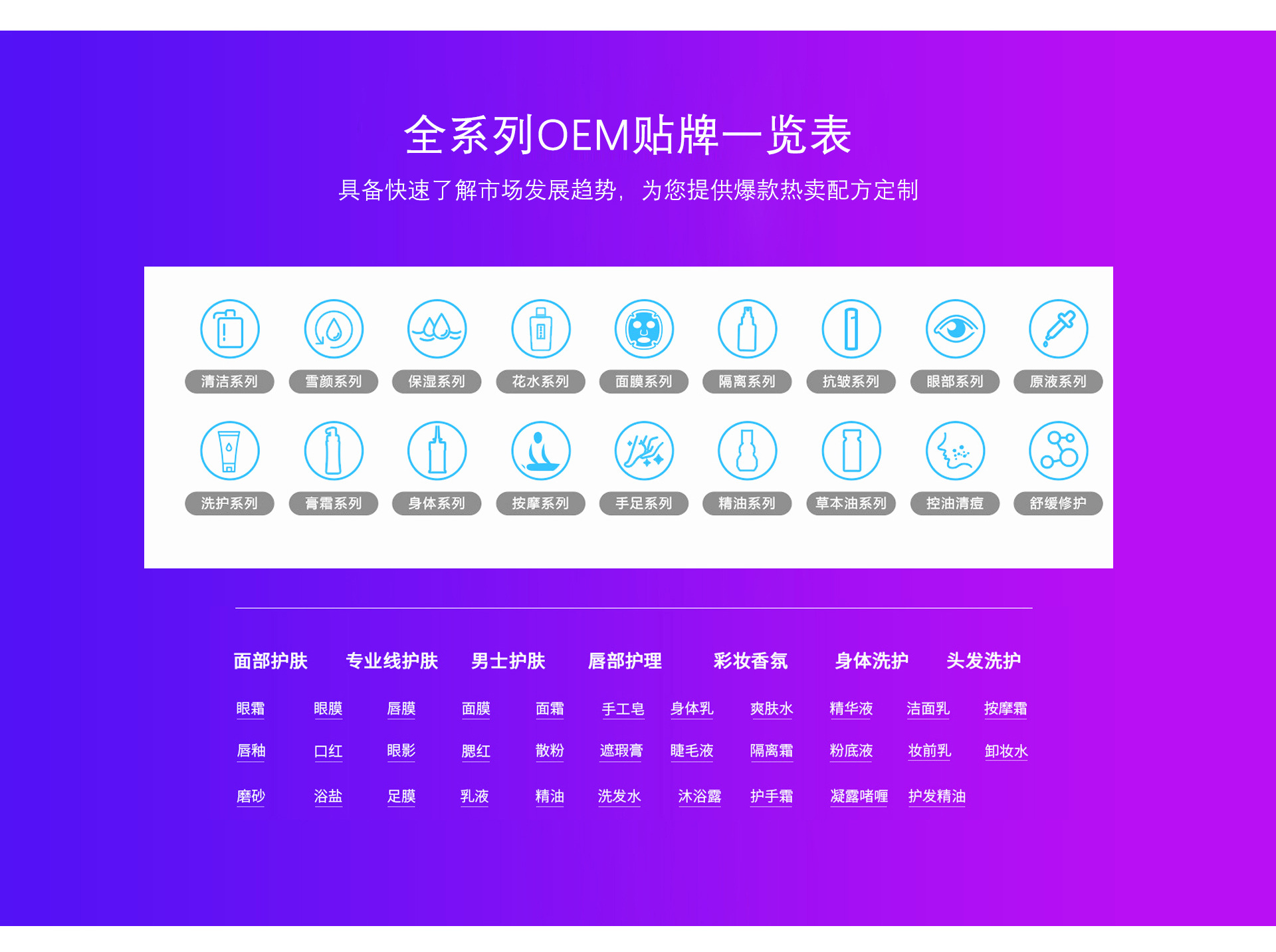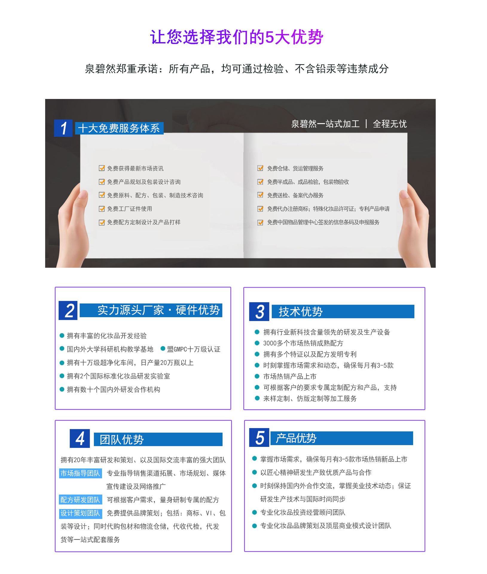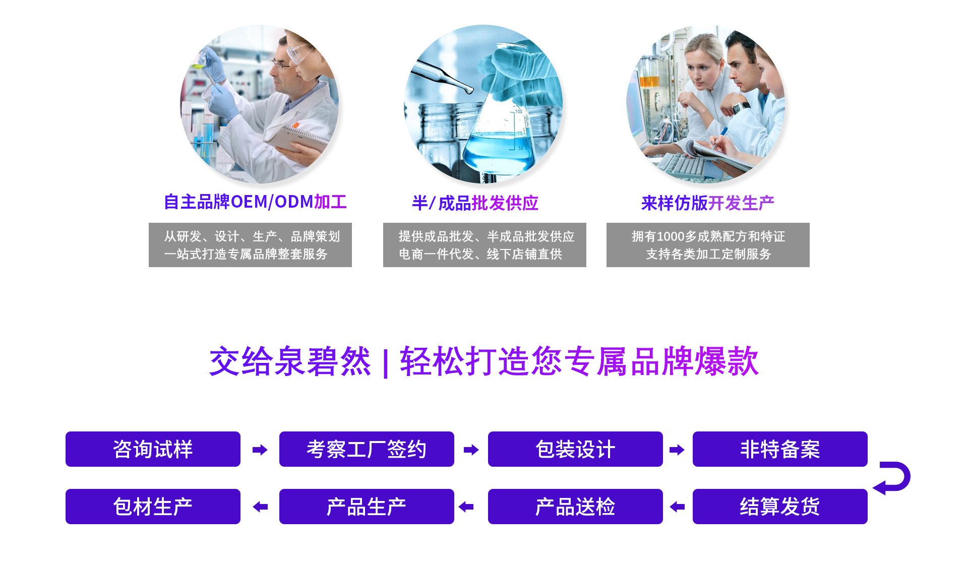 泉碧然(廣州)國際醫藥生物科技有限公司是一家融匯生物科技研發、生產制造、技術服務于一體的美容化妝品OEM/ODM/OBM現代化綜合企業,公司采用國內外先進的研發技術,啟用業界先進的管理系統,匯聚眾多國內外同行業科研技術精英,配置高端先進的生產流水線,公司以全新的經營理念為導向,以高科技為核心。以先進的設備為基礎,以優良的研發團隊為支柱,精心打造化妝品行業OEM龍頭企業,做適合各類肌膚適應的化妝品研發、生產、銷售的高端企業。涉及各類功效型護膚品,養生私護等系列產品,采用國內外高端進口原材料,研發新品,調配出您滿意的產品。公司位于廣州市白云區,占地面積約10000平方米, 并擁有十萬級GMP孵化灌裝車間和多個國際標準化的生產車間,具備消字號、妝字號、械字號等生產資質,擁有完整、科學的質量管理體系,能夠用最短的時