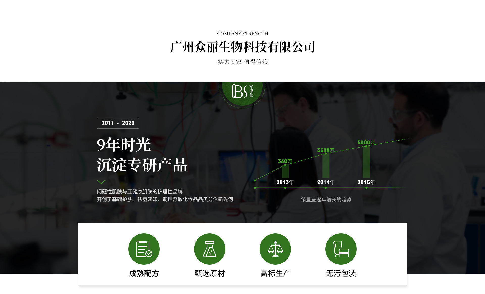 眾利集團(tuán)-廣州眾麗生物科技有限公司是集研發(fā)、貿(mào)易、銷售為一體,網(wǎng)絡(luò)遍及整個東南亞,在馬來西亞、新加坡、香港、臺灣等各大型連鎖化妝品店、藥妝、商超均有品牌銷售;公司主要以面霜、潔面乳、精華液、精華水、祛痘產(chǎn)品、護(hù)膚產(chǎn)品、洗發(fā)水、沐浴露等產(chǎn)品專業(yè)生產(chǎn)加工,擁有完整、科學(xué)的質(zhì)量管理體系。自2005年起,一路走來,眾利集團(tuán)讓無數(shù)的代理商、消費者見證了產(chǎn)品品質(zhì)和功能效果,收獲了無數(shù)消費者良好的口碑,年業(yè)績突破了8.6億,全國代理商突破8300家,市場終端網(wǎng)點突破45000家,市場專職團(tuán)隊人員高達(dá)1800人,這一年光“軍博仕”品牌總部團(tuán)隊人數(shù)就多達(dá)268人。 集團(tuán)公司正式在2013年初全面運作,其旗下各個公司的品牌與市場都是獨立運營,財務(wù)獨立核算,人事行政、客服系統(tǒng)、財務(wù)系統(tǒng)、物流系統(tǒng)采用統(tǒng)一化管理。公司每年業(yè)績增長100%;廣州眾麗生物科技有限公司的誠信、實力和產(chǎn)品質(zhì)量獲得業(yè)界的認(rèn)可。