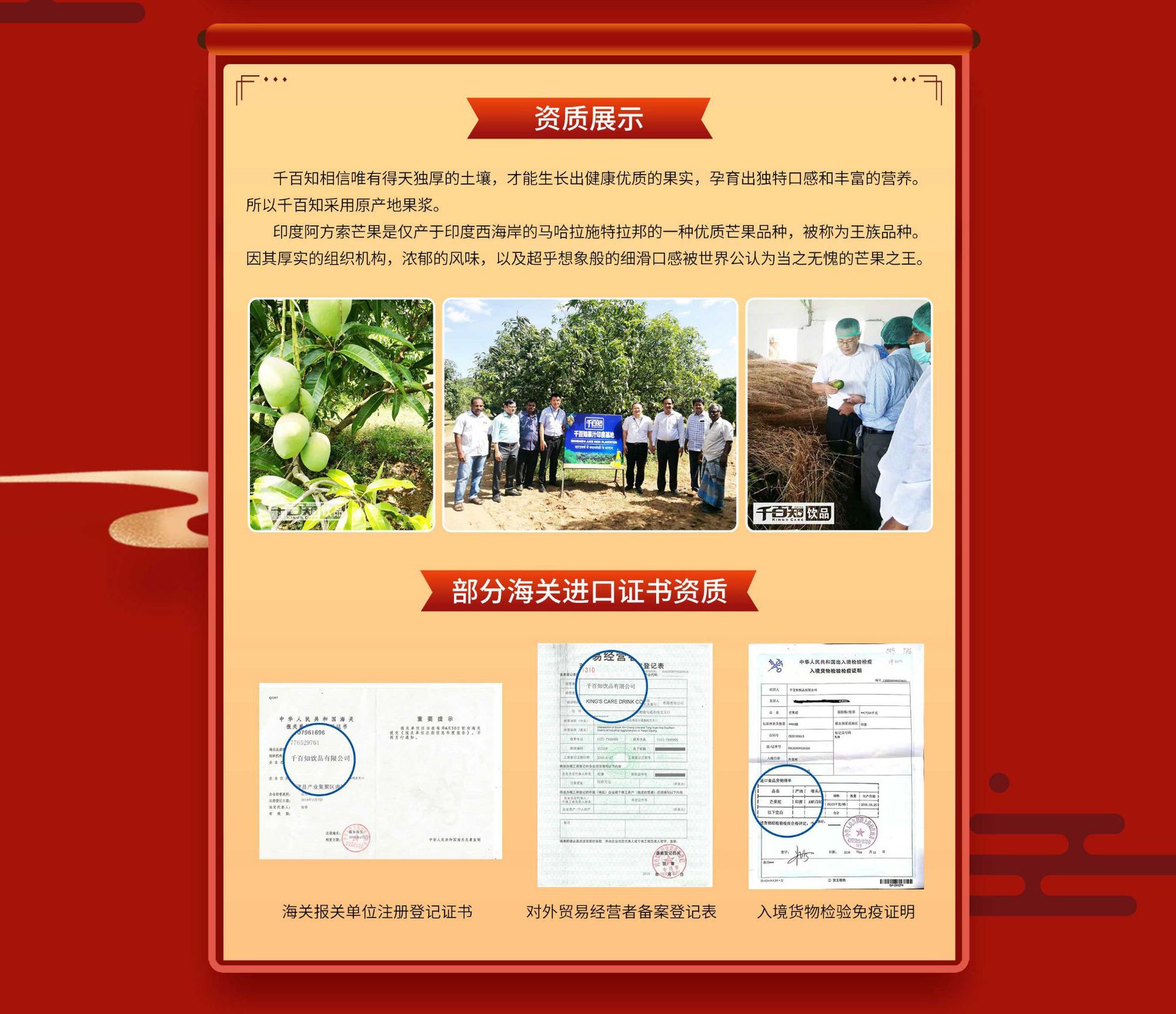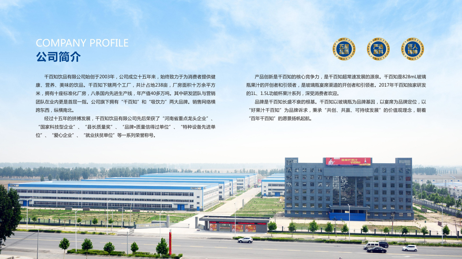 千百知飲品有限公司始創于2003年,迄今為止已經走過10余年的發展歷程。公司現有員工1000余人,其中研發團隊與營銷團隊更是業內的佼佼者,銷售團隊200余人。公司旗下有“千百知”和“吸飲力”兩大品牌,擁有7條果汁生產線,兩條包裝飲用水生產線,年產能40多萬噸,產值達10億元。目前,公司有800多家經銷商,40萬家售點,建立了橫跨東西,縱橫南北的市場網絡體系。 經過十多年的拼搏發展,千百知飲品有限公司先后榮獲了“河南2013年度品牌?質量信得過單位”、“2014年‘鄭州杯’全國毽球錦標賽指定飲品”、“2014年‘鄭州杯’全國毽球錦標賽指定水”、“河南省著名商標吸飲力”、“2014年度特種設備先進單位”、“2015年度愛心企業”“2017年度縣長質量獎”等一系列榮譽稱號。 產品創新是千百知的核心競爭力,是千百知超常速發展的源泉。千百知是828mL玻璃瓶果汁的開創者和領跑者。