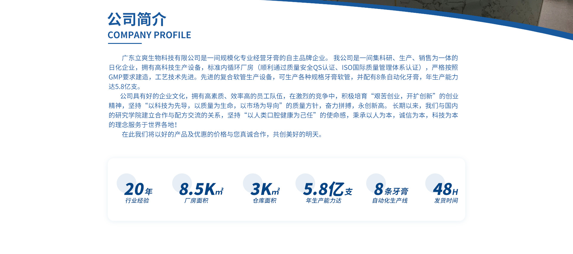 廣東立爽生物科技有限公司是一間規模化專業經營牙膏的自主品牌企業。 我公司是一間集科研、生產、銷售為一體的日化知名企業。高科技生產設備,標準內循環廠房,工藝技術先進。先進的復合軟管生產設備,可生產各種規格牙膏軟管。 公司具有獨特的企業文化,擁有高素質、高效率的員工隊伍,在激烈的競爭中,積極培育“艱苦創業,開擴創新”的創業精神,堅持“以科技為先導,以質量為生命,以市場為龍頭”的質量方針,奮力拼搏,永創新高。 長期以來,我們與國內的研究學院建立合作與配方交流的關系,堅持“以人類口腔健康為己任”的使命感,秉承以人為本,誠信為本,科技為本的理念服務于世界各地!在此我們將以一流的產品及更優惠的價格與您真誠合作,共創美好的明天