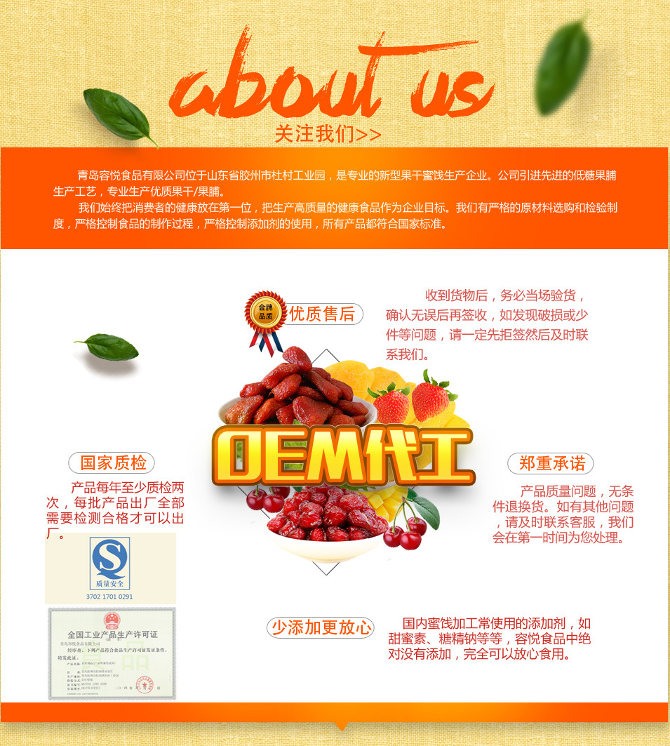 青島容悅食品有限公司成立于2007年,是一家專業的果干蜜餞生產廠家。產品采用科學的工藝,鮮果制作,不漂泊不硬化,添加劑的使用少之又少,嚴格按照國家標準生產。目前以散貨為主,也為眾多電商提供貼牌分裝。產品品類多,質量好,價格公道。14年老廠,值得信賴