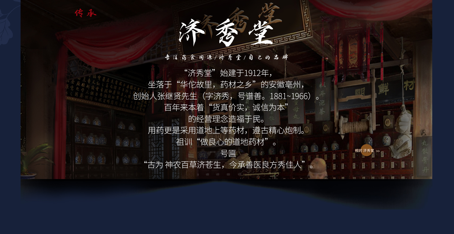 “濟秀堂”始建于1912年,坐落于“華佗故里,藥材之鄉”的安徽亳州,創始人張繼賢先生(字濟秀,號譜善。1881~1966)。百年來本著“貨真價實,誠信為本”的經營理念造福于民。用藥更是采用道地上等藥材,遵古精心炮制。祖訓“做良心的道地藥材”。號匾“古為 神農百草濟蒼生,今承善醫良方秀佳人”。