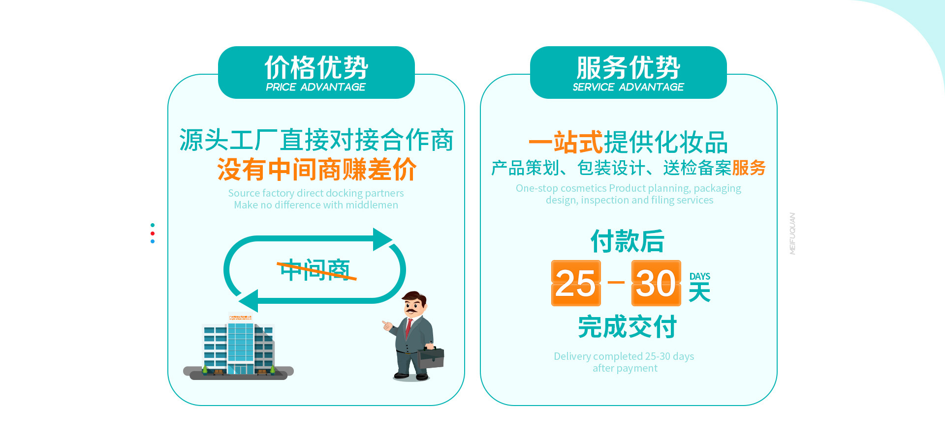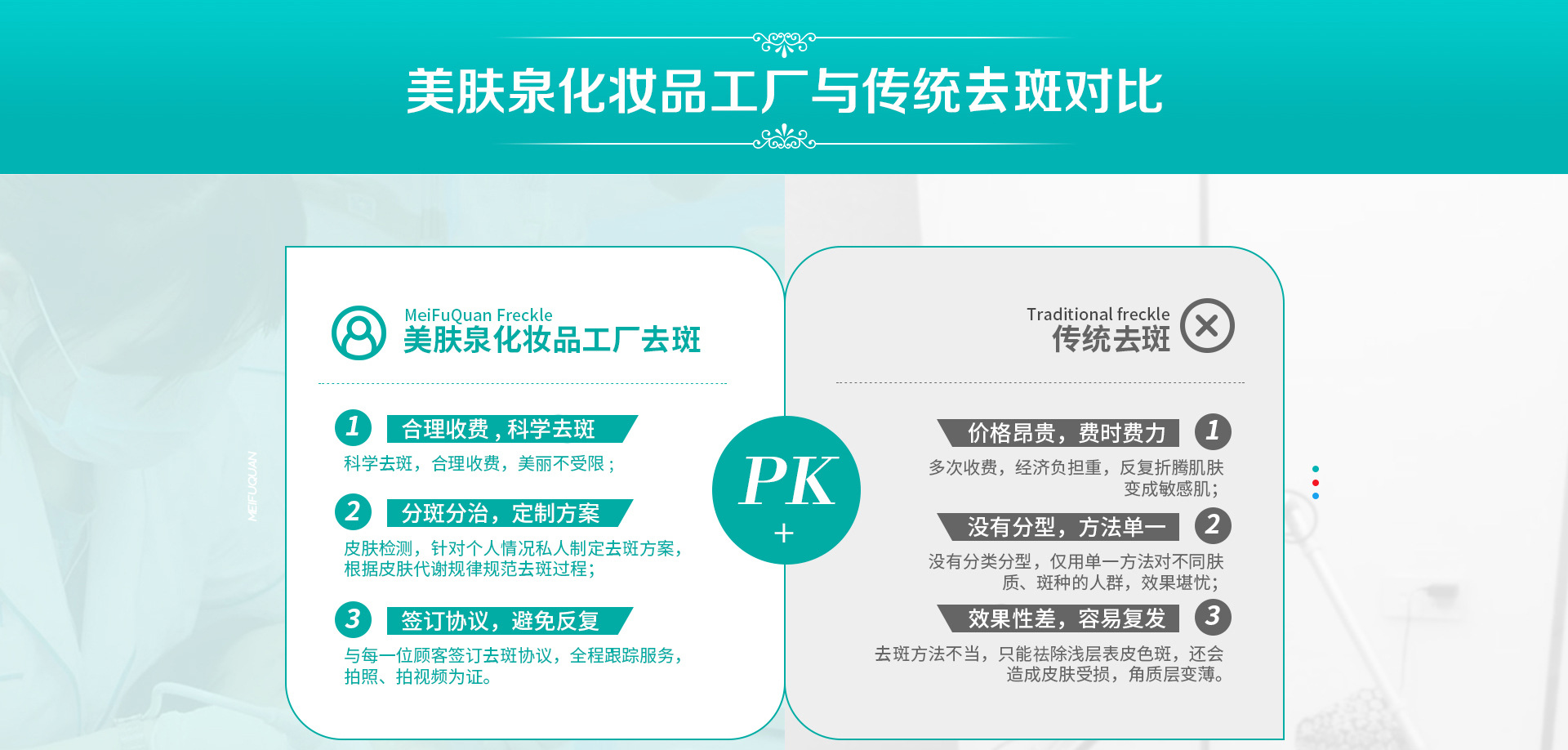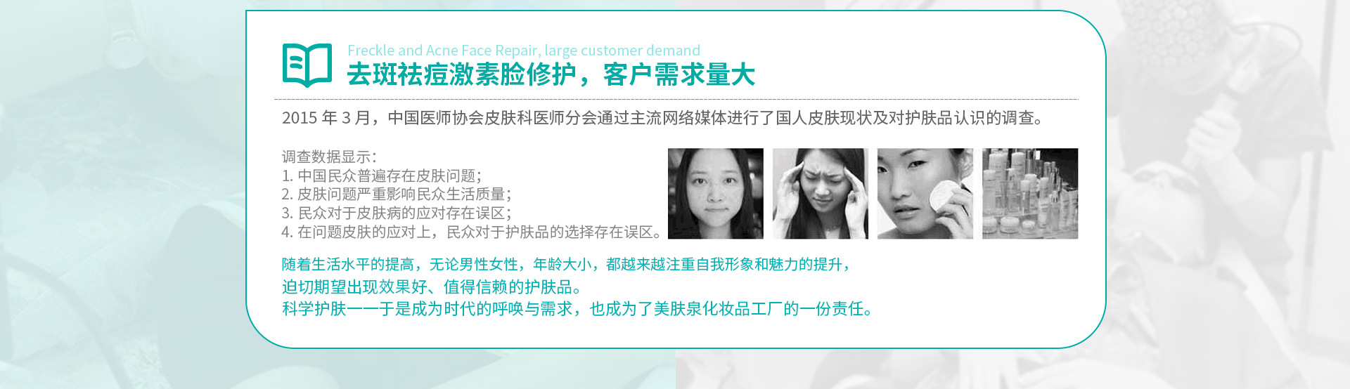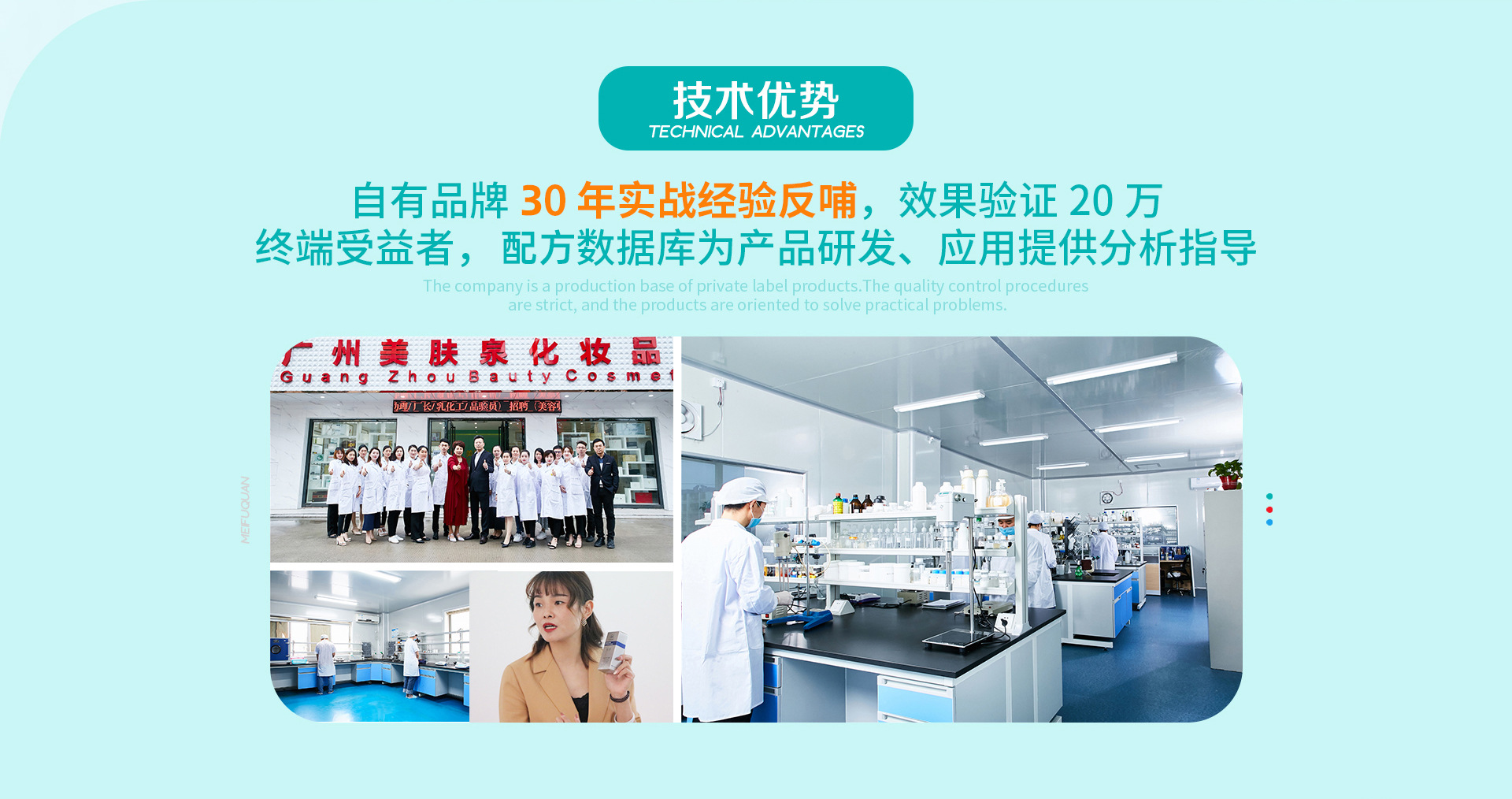 廣州美膚泉化妝品有限公司,是一家集產品研發、生產、銷售為一體的大型化妝品企業集團公司。專注于斑疤痘痣敏一站式服務/配方破解/技術培訓/運營策劃/全程專業指導對接。旗下公司有:廣州點奇靜化妝品有限公司、廣州繪萊雅化妝品有限公司、廣州亮果國際生物生物科技有限公司,三個大型化妝品生產基地??偣咀溆趶V州市白云區龍歸南嶺工業區,公司占地面積20000平方米,GMPC標準化妝品生產基地,10萬級無塵生產車間,妝字號,特字號,械字號,消字號工廠。公司主要從事化妝品OEM/ODM貼牌加工、護膚品加工、面膜加工、祛斑產品加工、洗護產品加工、精華原液加工、美白、保濕補水、祛痘祛斑、去紅血絲、去皺抗衰老等產品專業生產加工,提供日化線、專業線、電商微商等化妝品OEM/ODM加工服務,能為產品提供藥監備案、第三方送檢服務及正規三證。免費打樣,免費包材包裝設計,免費輔助備案!歡迎各界朋友蒞臨參觀、指導和業務洽談。