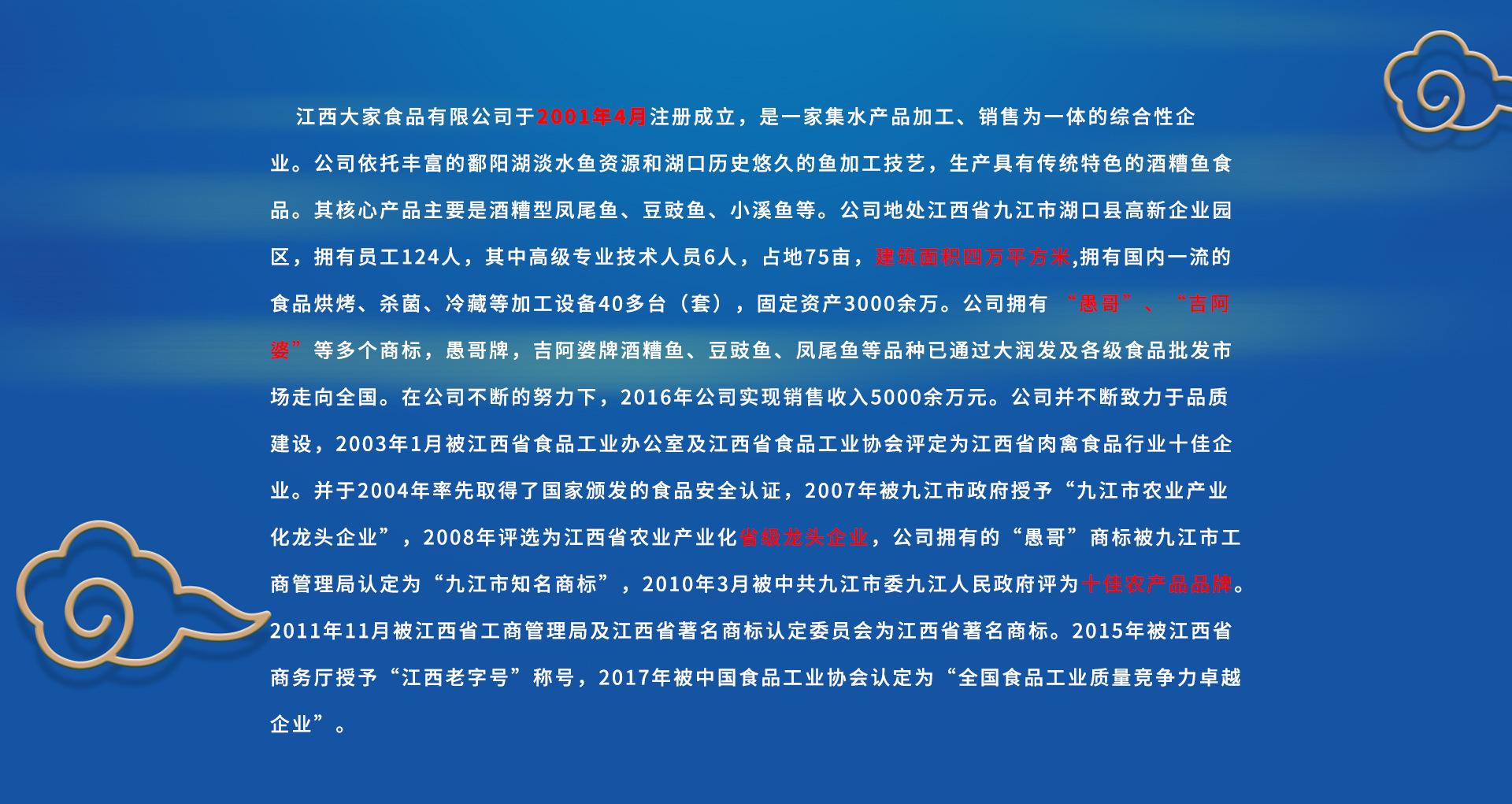 江西大家食品有限公司于2001年4月在湖口縣工商局注冊成立,是一家集水產品加工、銷售為一體的食品加工企業。公司依托鄱陽湖淡水魚豐富的資源和湖口歷史悠久的淡水魚加工技藝,生產具有傳統特色的酒糟魚食品,是一家規模型地方特色傳統產品加工企業,享有國家外貿自營權。其核心產品主要是酒糟型鳳尾魚、豆豉魚、小溪魚等。產品覆蓋江西全省及全國10余個省市和地區。產品包括禮品食品、旅游食品、方便食品、休閑食品等多個系列。