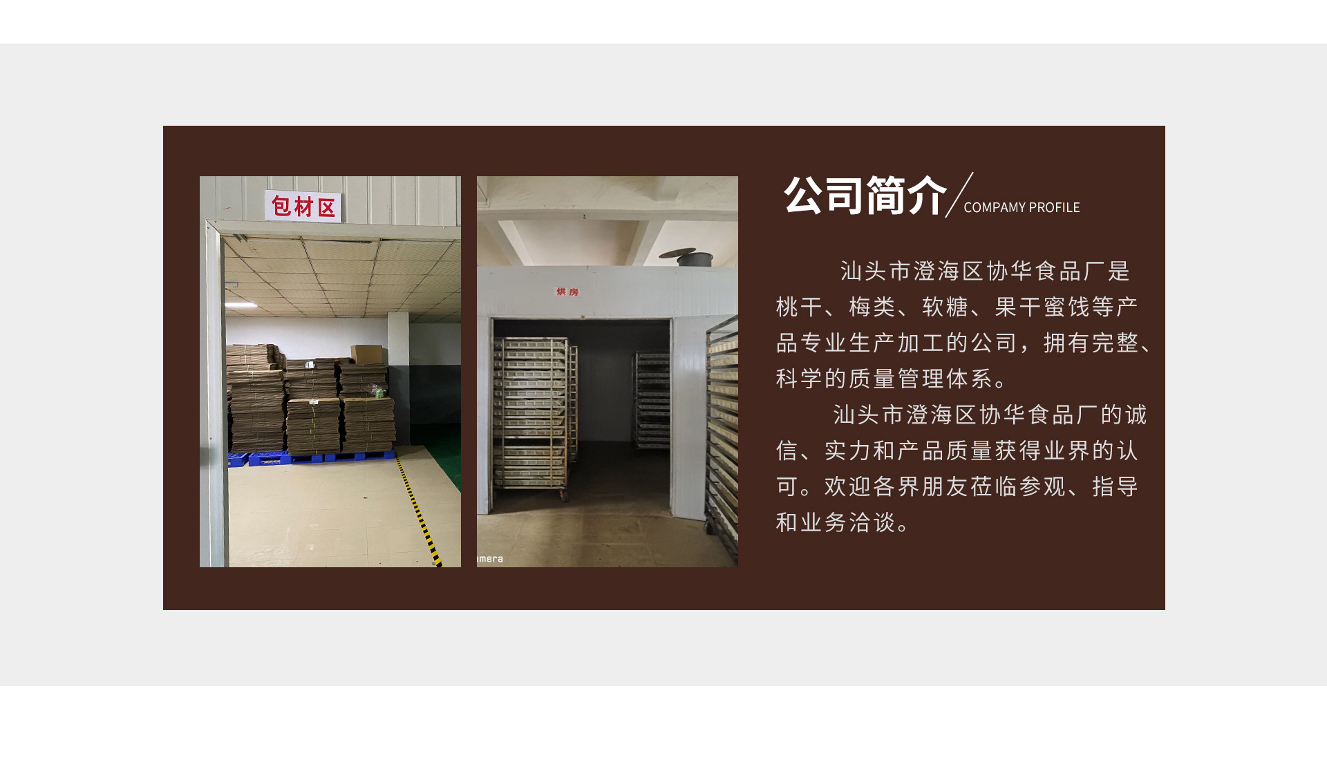 汕頭市澄海區協華食品廠是蜜餞、果脯等產品專業生產加工的公司,擁有完整、科學的質量管理體系。汕頭市澄海區協華食品廠的誠信、實力和產品質量獲得業界的認可。歡迎各界朋友蒞臨參觀、指導和業務洽談。