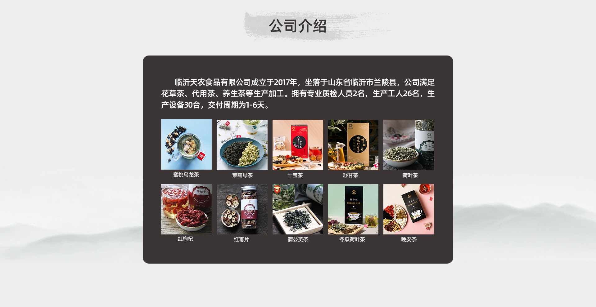 臨沂天農(nóng)食品有限公司成立于2017年,坐落于山東省臨沂市蘭陵縣,公司花茶類生產(chǎn)設(shè)備多樣化,可以滿足三角茶包、四角濾紙包、組合花茶等產(chǎn)品。擁有專業(yè)質(zhì)檢人員3名,生產(chǎn)工人120名,生產(chǎn)設(shè)備30多臺,日產(chǎn)量10000包,可以滿足各類客戶的定制化生產(chǎn)加工。