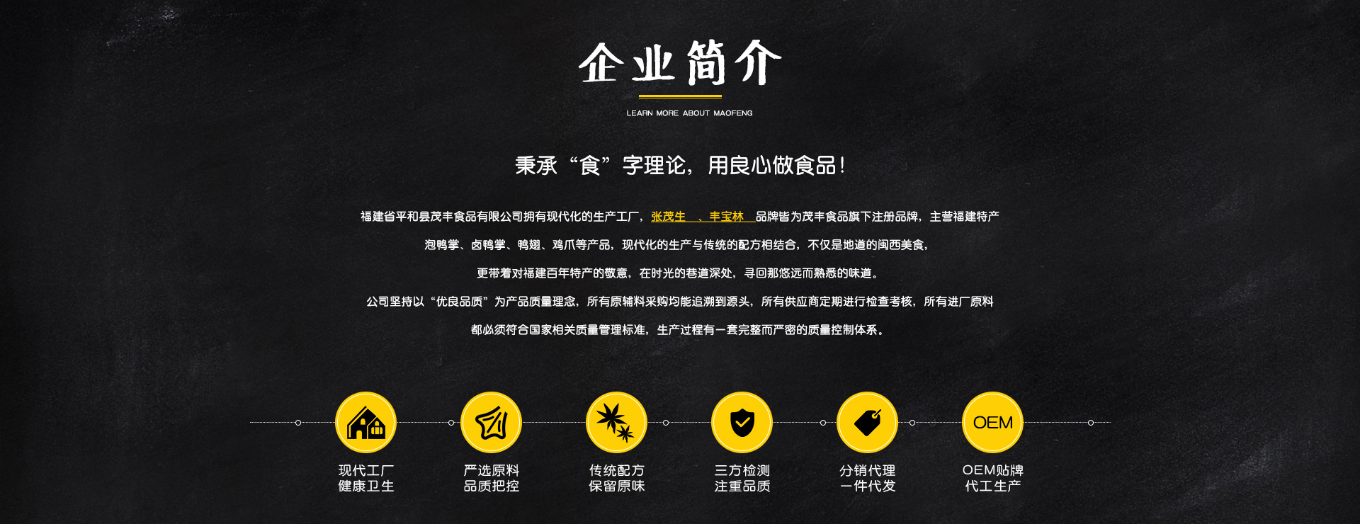 福建省平和縣茂豐食品有限公司是泡鴨掌、雞爪、鴨翅,烤肉豆腐等產品生產加工的公司,擁有完整、科學的質量管理體系
