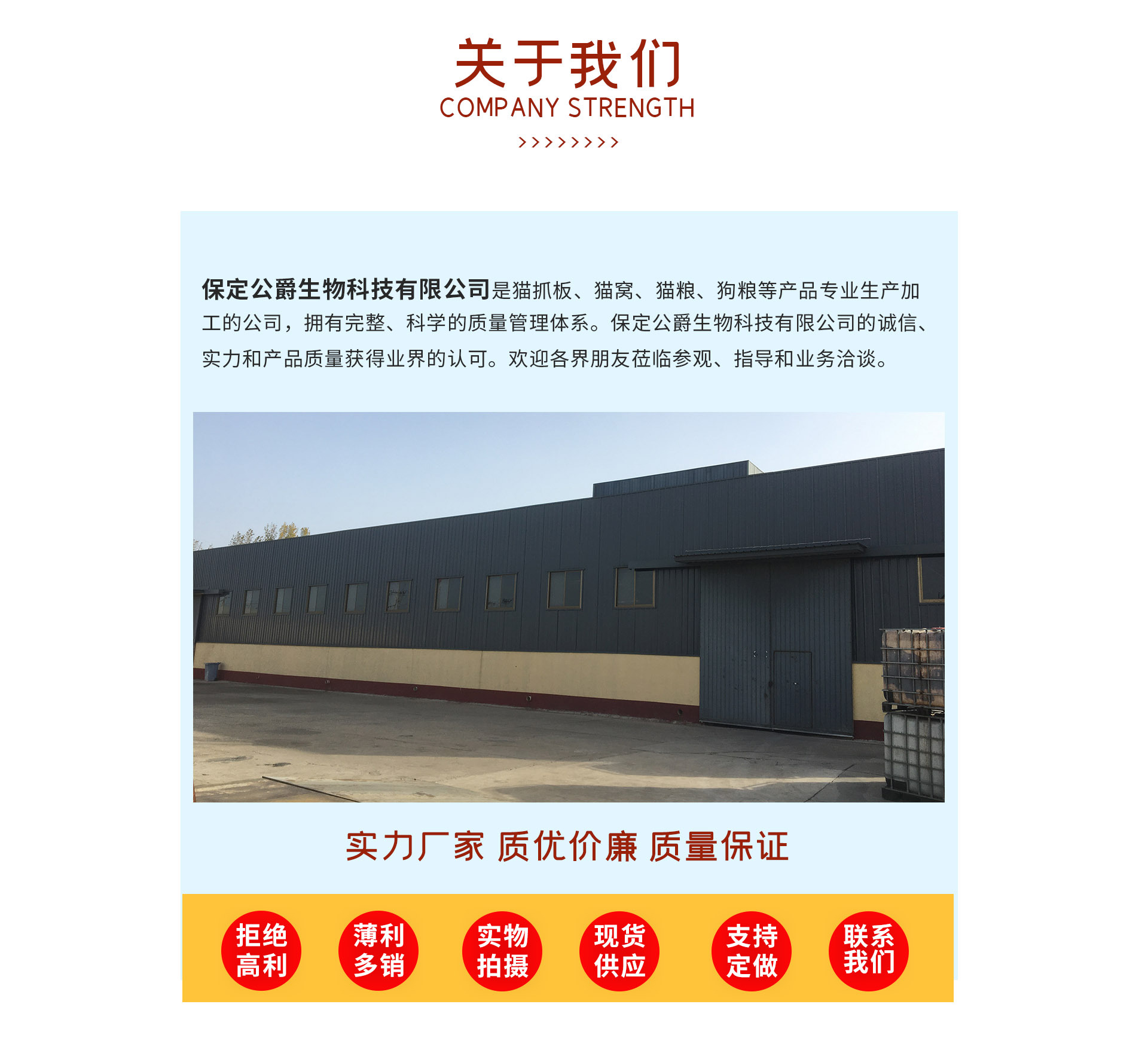 保定公爵生物科技有限公司是貓抓板、貓窩、貓糧、狗糧等產品專業生產加工的公司,擁有完整、科學的質量管理體系。保定公爵生物科技有限公司的誠信、實力和產品質量獲得業界的認可。歡迎各界朋友蒞臨參觀、指導和業務洽談。