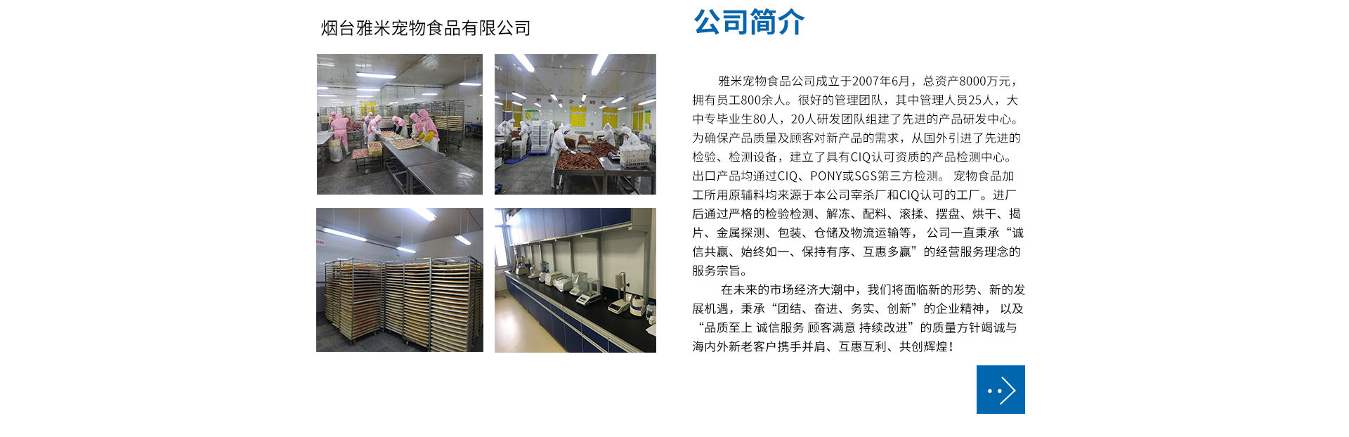煙臺雅米寵物食品有限公司隸屬于新永康外貿食品集團,集團成立于80年代,具有30多年畜牧業產業鏈經驗。雅米寵物食品成立于2007年6月,是國內第一批生產零食寵物的廠家。