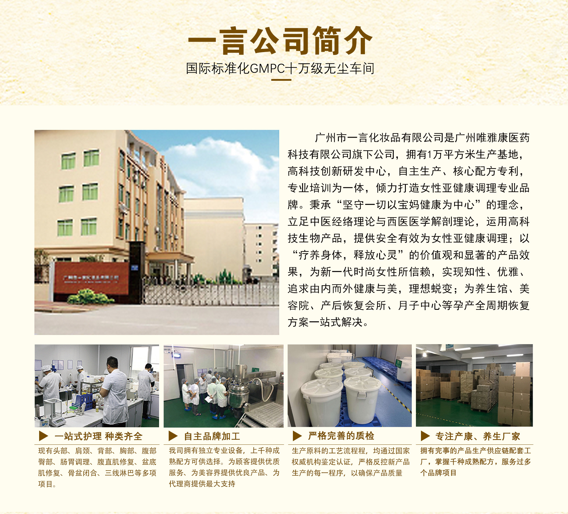 廣州市一言化妝品有限公司擁有1萬平方米生產基地,高科技創新研發中心,自主生產、核心配方專利,專業培訓為一體,傾力打造女性亞健康調理專業品牌。秉承“堅守一切以寶媽健康為中心”的理念,立足中醫經絡理論與西醫醫學解剖理論,運用高科技生物產品,提供安全有效為女性亞健康調理;以“療養身體,釋放心靈”的價值觀和顯著的產品效果,為新一代時尚女性所信賴,實現知性、優雅、追求由內而外健康與美,理想蛻變;為養生館、美容院、產后恢復會所、月子中心等孕產全周期恢復方案一站式解決