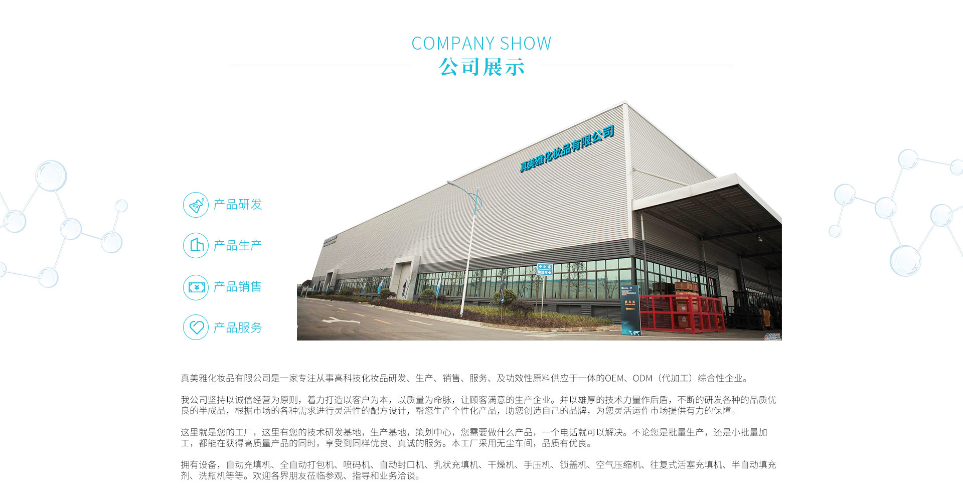 真美雅化妝品有限公司是一家專注從事高新技術化妝品研發、生產、銷售、服務及功效性原料一體的OEM、ODM(代加工)綜合性企業。我公司堅持以誠信經營為原則,著力于打造以客戶為本,以質量為命脈,讓客戶滿意的生產企業。并以雄厚的技術力量作后盾,不斷研發各種品質優良的化妝品半成品,根據市場的各種需求進行靈活性的配方設計,幫您生產個性化產品,助您創造自己的品牌,為您靈活運作市場提供有力的保障。 這里就是您的工廠,這里有您的技術研發基地,生產基地,策劃團隊,您需要什么產品,一個電話就可以解決。不論您是批量生產,還是小批量加工,都能再獲得高質量產品的同時,享受到同樣優良、真誠的服務。 本工廠擁有自動填充機、全自動打包機、噴碼機、自動封口機、乳狀充填機、干燥機、手壓機、鎖蓋機、空氣壓縮機、往復式活塞填充機、半自動填充機、洗瓶機等等。歡迎各界朋友參觀、指導和業務洽談。