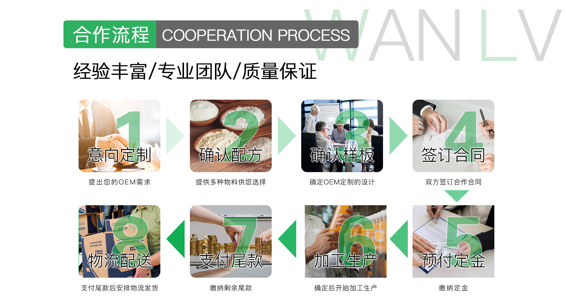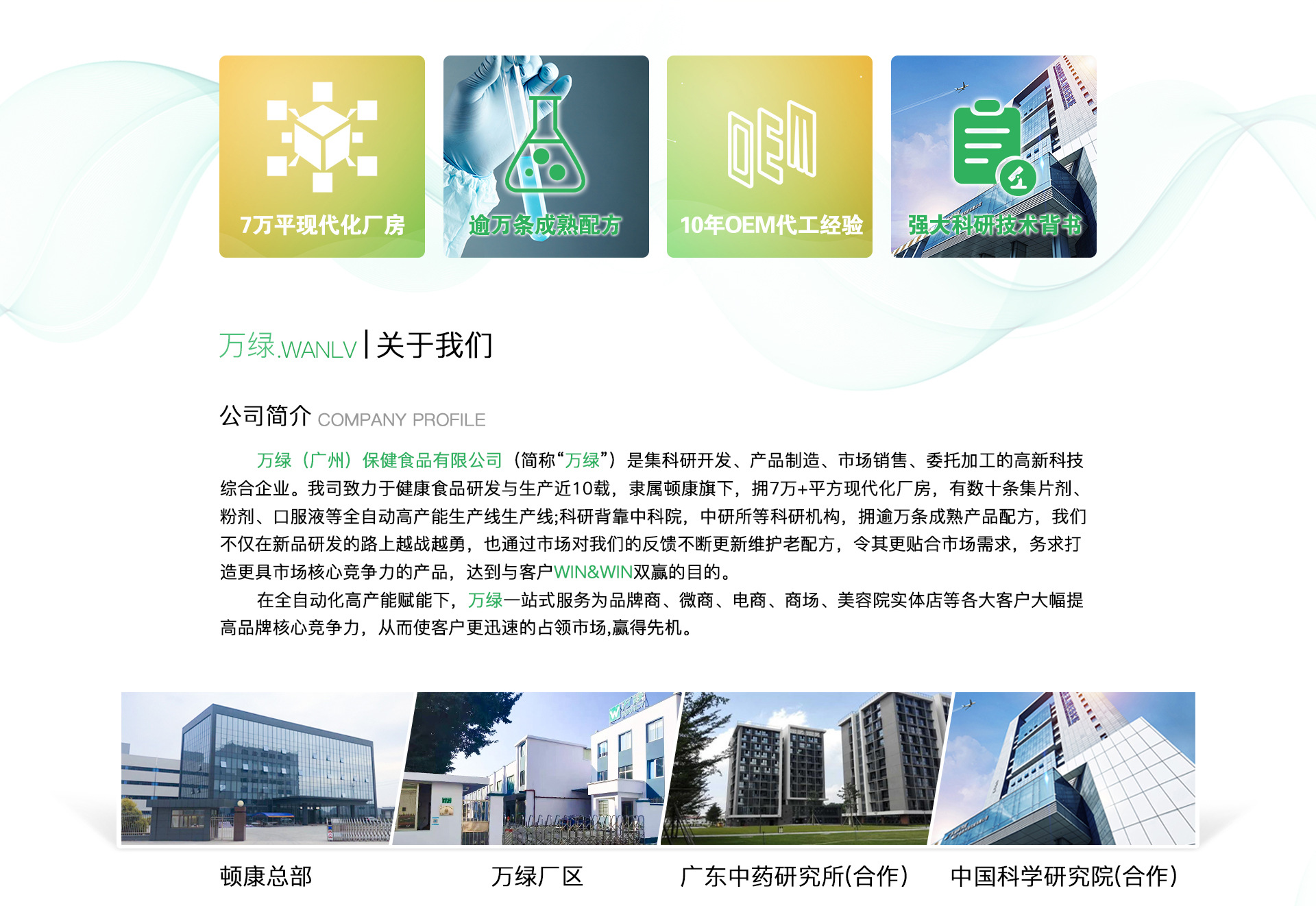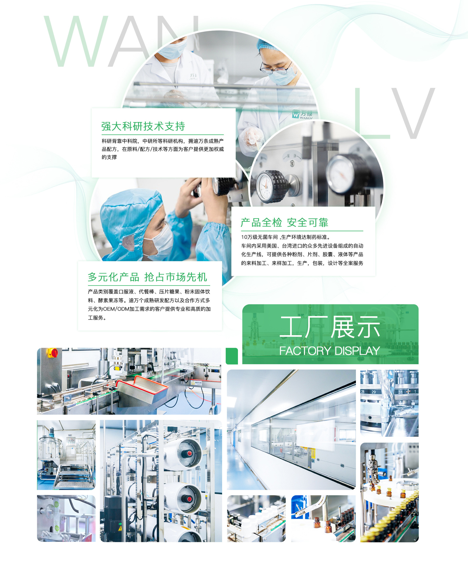 萬綠(廣州)保健食品有限公司 專注于健康領域的研發與生產,主營片劑如人參鹿鞭片、vc片;固體飲料如益生菌、膠原蛋白粉、代餐粉、酵素粉,咖啡,飲品如膠原蛋白口服液,酵素液,膠原肽口服液等 專業訂制研發專屬產品,擁有完整、科學的質量管理體系。 萬綠擁有強大的研發實力,擁有近百項專利,賦予產品更多附加值,萬綠工廠擁有SC、SGS等多項國內外安全體系認證,產品投保CPIC太平洋保險,與中國眾多上市企業和大型集團企業建立緊密的合作伙伴關系,并得到中國科學院認可,中科院授予萬綠為中醫中藥研發及產業轉化中心。擁有國內外先進的保健食品是生產設備和完整的生產能力。 占地面積4243平方米、建筑面積3008平方米,擁有現代化保健營養食品生產線2條、十萬級潔凈生產車間2000平方米,具備粉劑、顆粒劑、片劑、口服液等4種劑型保健營養食品的生產能力。萬綠公司以誠信、實力和產品質量自持,只做良心產品,歡迎臨參觀考證。