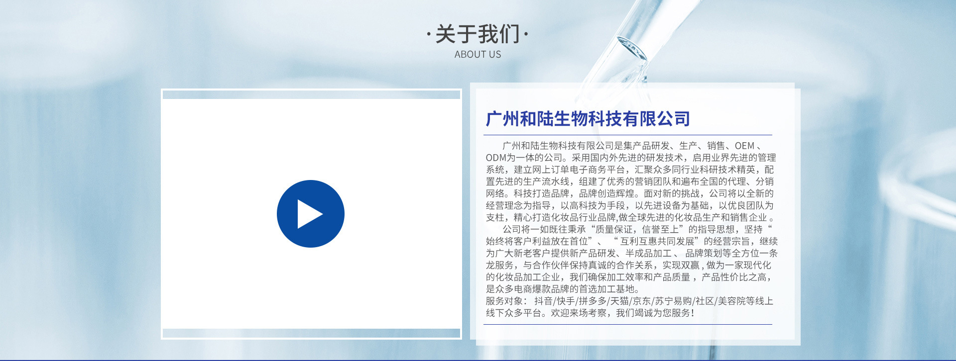 廣州和陸生物科技有限公司是集產品研發、生產、銷售、OEM 、ODM為一體的公司。采用國內外先進的研發技術,啟用業界先進的管理系統,建立網上訂單電子商務平臺,匯聚眾多同行業科研技術精英,配置先進的生產流水線,組建了優秀的營銷團隊和遍布全國的代理、分銷網絡。科技打造品牌,品牌創造輝煌。面對新的挑戰,公司將以全新的經營理念為指導,以高科技為手段,以先進設備為基礎,以優良團隊為支柱,精心打造化 妝品行業品牌,做全球先進的化妝品生產和銷售企業 。 我們的企業宗旨:為顧客提供超值的產品和優質的服務。 我們的企業理念:關心每一位員工的成長,提升每一位員工的價值。 我們的管理方針:在制度化為原則的基礎上,以人為本充分發揮每個人的潛能,能者上,庸者下,閑者走。 我們的企業精神:公司一直堅持“ 質量是企業的生命”的指導原則 ,建立有一套完善的從原料、小試、中試、半成品到穩定性、