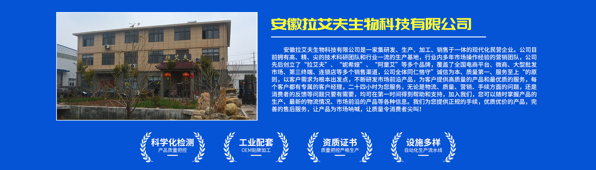 安徽拉艾夫生物科技有限公司是一家集研發(fā)、生產(chǎn)、加工、銷售于一體的現(xiàn)代化民營企業(yè)。公司目前擁有高、精、尖的技術(shù)科研團隊和行業(yè)一流的生產(chǎn)基地,行業(yè)內(nèi)多年市場操作經(jīng)驗的營銷團隊,公司先后創(chuàng)立了“拉艾夫”、“妮希婭”、“阿童艾”等多個品牌,覆蓋了全國電商平臺、微商、大型批發(fā)市場、第三終端、連鎖店等多個銷售渠道,公司全體同仁恪守”誠信為本、質(zhì)量第一、服務(wù)至上“的原則,以客戶需求為根本出發(fā)點,不斷研發(fā)市場前沿產(chǎn)品,為客戶提供高質(zhì)量的產(chǎn)品和最優(yōu)質(zhì)的服務(wù),每個客戶都有專屬的客戶經(jīng)理,二十四小時為您服務(wù),無論是物流、質(zhì)量、營銷、手續(xù)方面的問題,還是消費者的反饋等問題只要有需要,均可在第一時間得到幫助和支持,加入我們,您可以隨時掌握產(chǎn)品的生產(chǎn)、最新的物流情況、市場前沿的產(chǎn)品等各種信息。我們?yōu)槟峁┱?guī)的手續(xù),優(yōu)質(zhì)優(yōu)價的產(chǎn)品,完善的售后服務(wù),讓產(chǎn)品為市場吶喊,讓質(zhì)量令消費者尖叫!