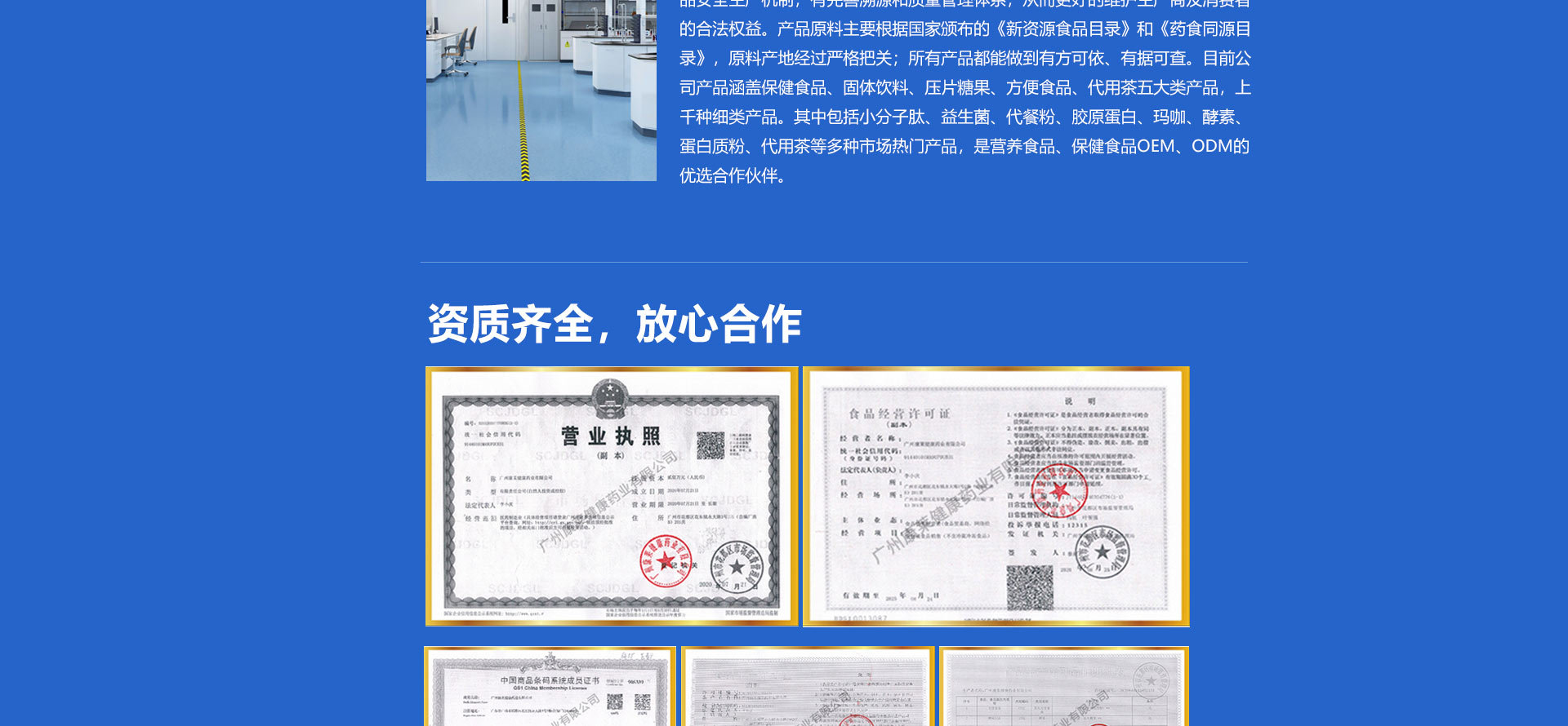 廣州康萊健康藥業有限公司是一家綜合性健康食品及生物技術研發服務企業,主營保健食品、營養食品、新資源食品生產加工OEM、ODM,招商等業務。 公司斥資2000余萬元在廣州市花都區重金打造了占地面積達數千余平米的全新現代化高標準保健食品生產廠區,自主物業,獨立廠房。引進多臺高科技生產設備,擁有國際標準化實驗室,配備先進實驗研發設備,與國內一線科研人才合作組建專業研發團隊,實行研產一體化,并將科研成果轉化為生產力,為產業化生產提供技術支撐。為企業長久發展提供保障。 廣州康萊健康藥業有限公司以強大的研發團隊為技術依托,嚴格執行國家食品安全生產機制,原料產地經過嚴格把關;目前公司產品涵蓋保健食品、固體飲料、壓片糖果、方便食品、代用茶五大類產品,上千種細類產品。其中包括小分子肽、益生菌、代餐粉、膠原蛋白、瑪咖、酵素、蛋白質粉、代用茶等多種市場熱門產品,是優選客戶合作的最佳伙伴。