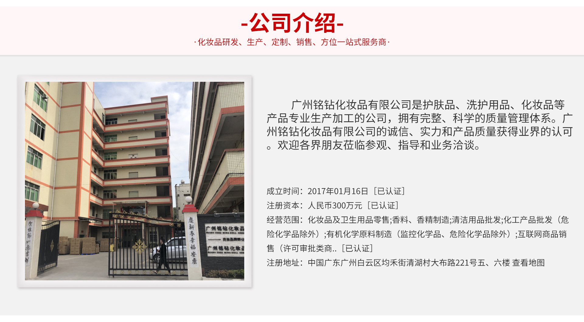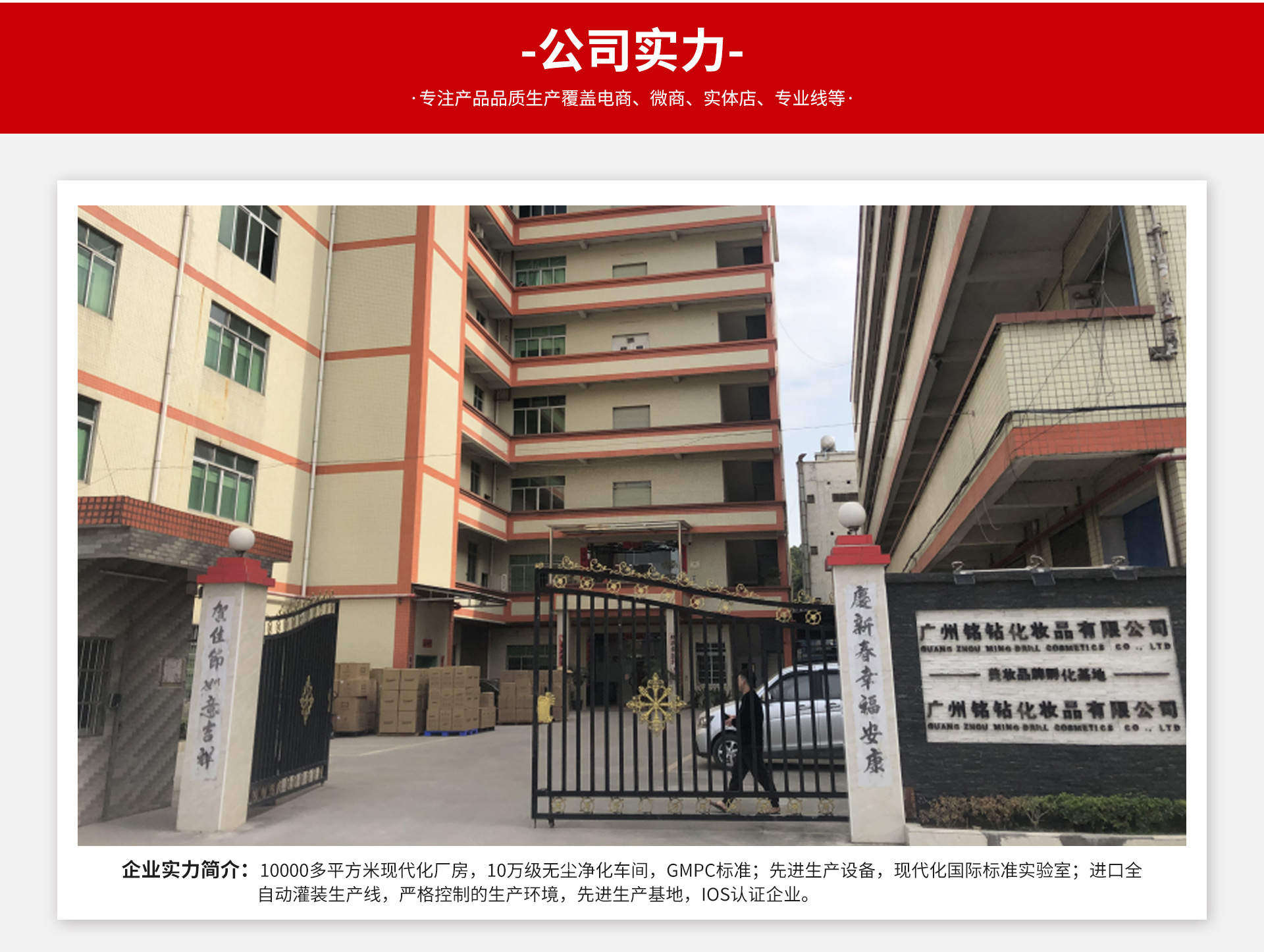 廣州銘鉆化妝品有限公司是美容護膚、美容精華液、面膜、凍干粉、臉部護理、洗發水、沐浴露、精油等產品專業生產加工的公司,擁有完整、科學的質量管理體系。廣州銘鉆化妝品有限公司的誠信、實力和產品質量獲得業界的認可。歡迎各界朋友蒞臨參觀、指導和業務洽談。