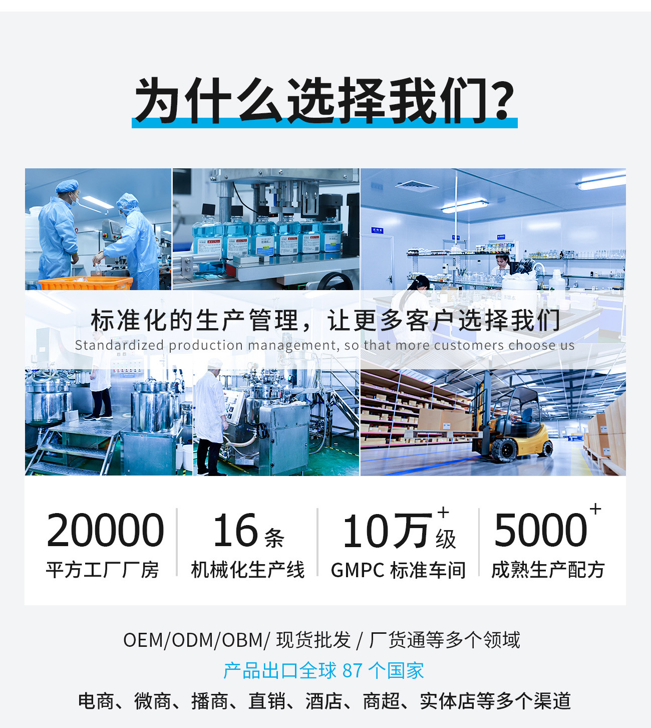 廣東艾慕生物科技有限公司擁有廠房20000多平方米,旗下有廣州市一龍化妝品有限公司和廣州市海詩(shī)生物科技有限公司,是一家集化妝品研發(fā)、生產(chǎn)、銷(xiāo)售綜合性公司,交通便利,座落在風(fēng)景優(yōu)美的白云山腳下,離白云機(jī)場(chǎng)約30分鐘路程,通過(guò)了ISO9001 、GMPC,美國(guó)FDA 認(rèn)證,為阿里巴巴國(guó)際站多年金牌會(huì)員,具有豐富的OEM、ODM經(jīng)驗(yàn),旨在打造化妝品行業(yè)OEM 加工NO.1! 公司化學(xué)技術(shù)基礎(chǔ)雄厚,經(jīng)營(yíng)多年,同各原材料供應(yīng)商建立了廣泛的協(xié)作關(guān)系,在把握化妝品生產(chǎn)新潮流方面,具有獨(dú)特的領(lǐng)先優(yōu)勢(shì);在管理上稟行“客戶至上,互惠互利”的管理理念,具備了良好的客戶基礎(chǔ);擁有一支多年品牌公司經(jīng)驗(yàn)的管理隊(duì)伍和一支“狼性’銷(xiāo)售團(tuán)隊(duì),目前生產(chǎn)的產(chǎn)除銷(xiāo)往國(guó)內(nèi),還銷(xiāo)售美國(guó)、歐洲、中東、東南亞、非洲國(guó)家和地區(qū),客戶反應(yīng)非常好,許多客戶已經(jīng)是多年的合作關(guān)系,公司向客戶承諾:“客戶至上,互惠互利”,努力為客戶提供最合理的價(jià)格。