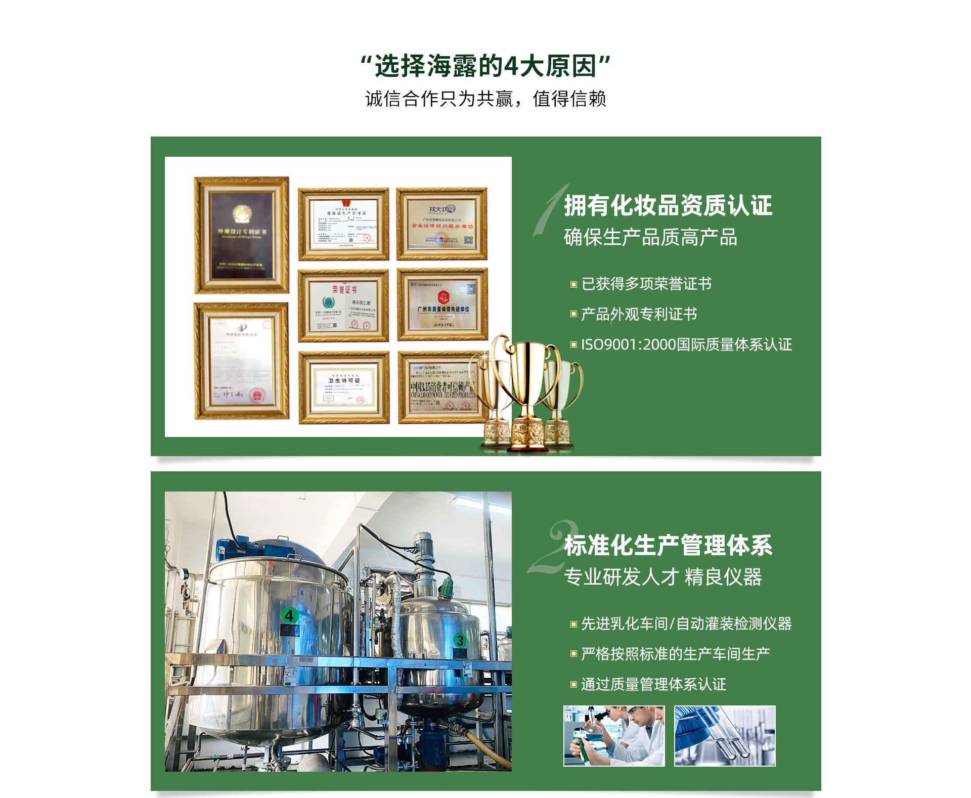 廣州市海露化妝品有限公司(以下簡稱“海露化妝品”)成立于1998年的廣州市海露化妝品有限公司座落在風景秀麗的廣州白云山下,毗鄰廣州新白云國際機場,是國內化妝品研發、經營的大型現代一體化生產企業,公司建有10000平方米的現代化功能型廠房,功能完善的辦公大樓、研發實驗室、生產車間及員工宿舍、配備齊全、環境優美。建立完善的質量管理體系并通過ISO9001:2000國際質量體系認證,并具有一批科技技術雄厚的專業技術精英在從事著海露產品的研究與開發。完善嚴密的質量保證系統,務實求真的海露人,領先行業研發優勢 ,用科技智慧孕育成功。 創新持續發展是海露人前進不忘的引領旗幟,廣州海露針對國內外客戶的不同要求,一直不斷開發新的優質產品,引領市場新方向。 時至今日,海露公司圍繞美妝用品產業設立綜合性、多功能、高效益的目標,產品暢銷國內及泰國、越南、緬甸、菲律賓等國家,市場份額一直穩居同行業品牌前列。