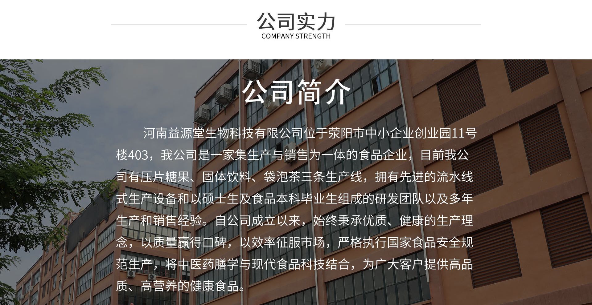 河南益源堂生物科技有限公司,是一家綜合性健康生物制品企業,主營健康食品,SC營養食品OEM、ODM、招商等業務。是一家專業從事高新生物技術研究和健康營養品開發的研發型企業,由國內名牌大學生命科學園多位專家教授、博士等人員主導研發,擁有適于不同年齡結構人群的健康營養品組方。在國內享有其技術和營養品組方使用權;產品原料主要根據國家頒布的《新資源食品目錄》和《藥食同源目錄》,原料產地也經過嚴格把關;產品做到有方可依、有據可查。目前公司產品劑型涵蓋壓片糖果、片劑、沖劑和固體飲料等多種劑型的生產流水線。并建立了全新現代規范化十萬級凈化車間,引進一系列先進生產設備,制粒混合設備、干燥設備、高速壓片機、激光噴碼機以及全自動灌裝線等多種劑型的生產流水全新的現代化規范化生產廠區、裝備多臺生產設備以及成立專項實驗室,配備先進實驗設備,引進國內大學的相關專業