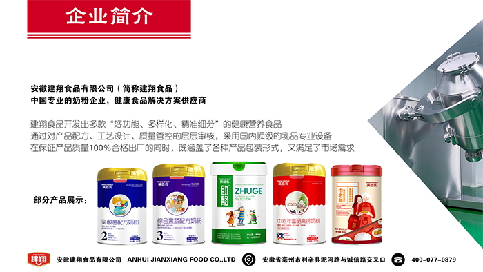 安徽建翔食品有限公司(簡稱建翔食品)成立于2003年,企業(yè)在2020年被安徽省重點招商引資的乳制品專業(yè)企業(yè),是安徽省唯一一家調(diào)制乳粉工廠,也是國內(nèi)專業(yè)健康食品解決方案供應(yīng)商,集調(diào)制奶粉、特色乳制品、營養(yǎng)保健品、功能性營養(yǎng)品等研發(fā)、生產(chǎn)、銷售于一體。