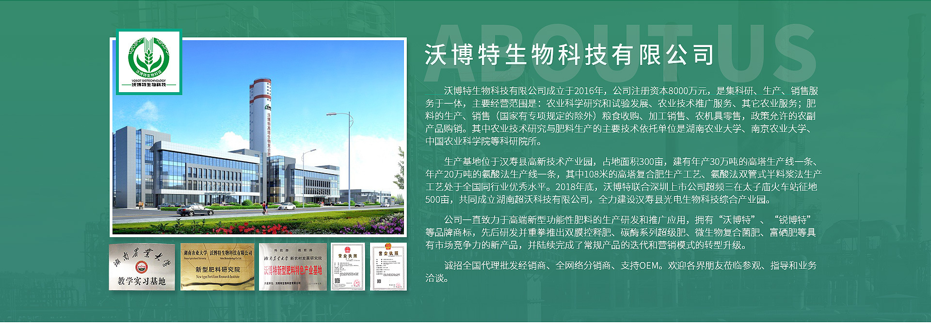 沃博特生物科技有限公司成立于2016年,公司注冊資本8000萬元,集科研、生產、銷售服務于一體,主營范圍:農業科學研究和試驗發展、農業技術推廣服務、其它農業服務;肥料的生產、糧食收購(國家有專項規定的除外)、加工銷售、農機具零售,政策允許的農副產品購銷。其中農業技術研究與肥料生產的主要技術依托單位是湖南農業大學、南京農業大學、中國農業科學院等科研院所。 生產基地位于漢壽縣高新技術產業園,占地面積300畝,建有年產30萬噸的高塔生產線一條、年產20萬噸的氨酸法生產線一條,其中108米的高塔復合肥生產工藝、氨酸法雙管式半料漿法生產工藝處于全國同行業優秀水平。2018年底,沃博特聯合深圳上市公司超頻三在太子廟火車站征地500畝,共同成立湖南超沃科技有限公司,全力建設漢壽縣光電生物科技綜合產業園。 誠招全國代理批發經銷商、全網絡分銷商、支持OEM。歡迎各界朋友蒞臨參觀、指導和洽談業務。