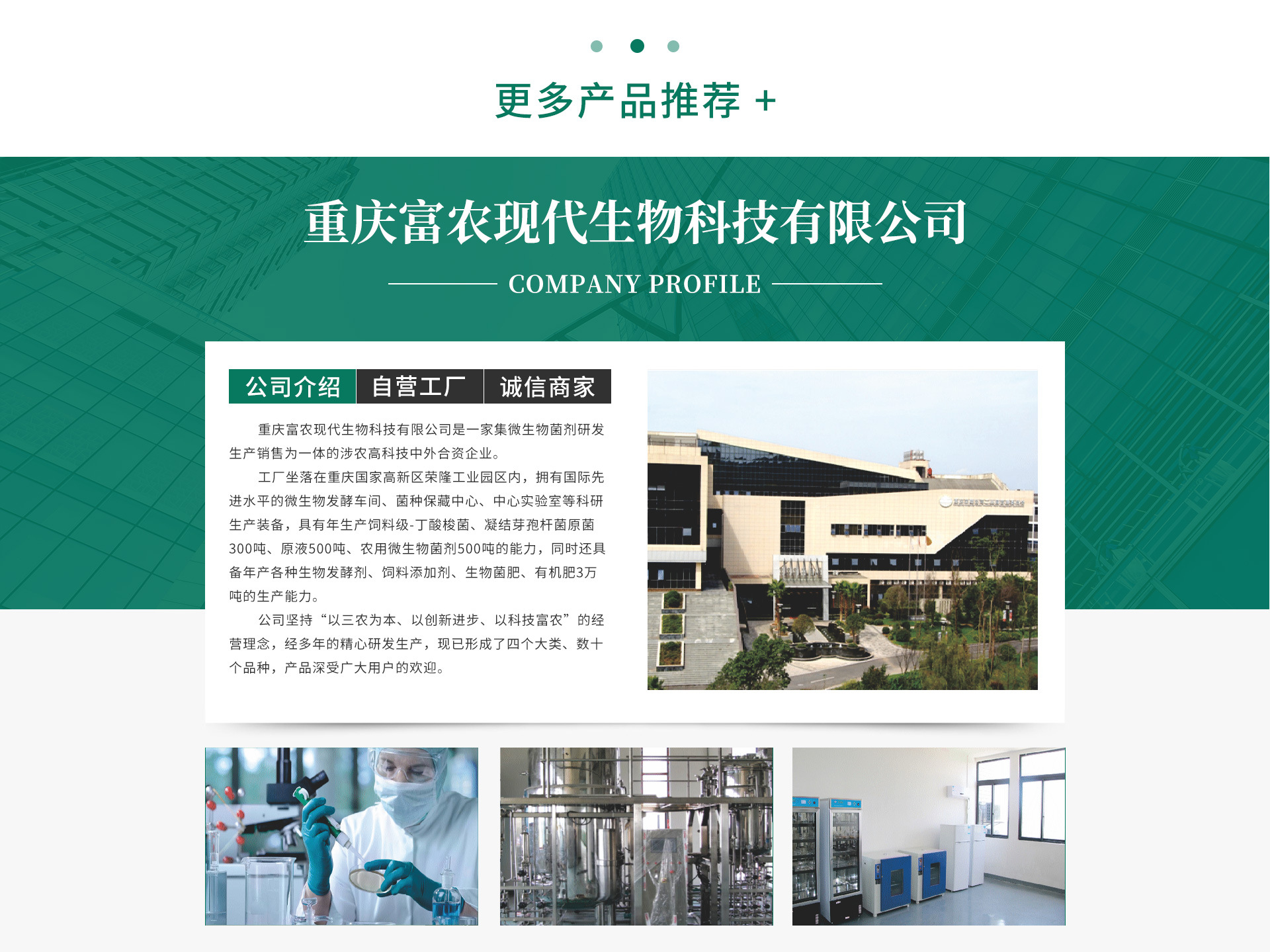 重慶富農現代生物科技有限公司是一家集微生物菌劑研發、生產、銷售為一體的涉農高科技中外合資企業。工廠坐落在重慶國家高新區榮隆工業園區內,擁有國際先進水平的微生物發酵車間、菌種保藏中心、中心實驗室等科研、生產裝備,具有年生產丁酸梭菌、凝結芽孢桿菌等飼用菌種原液500噸、粉狀菌劑200噸的生產能力,同時還具備年產各種生物發酵劑、飼料添加劑、生物有機肥和菌肥500噸的生產能力。 公司多年來以科技創新為抓手,不斷提高科技研發能力和市場核心競爭力。公司已擁有多項專利技術,被重慶市科委評定為《科技型企業》和《國家高新技術企業》。公司通過了國家QHSE標準化管理體系認證,產品由太平洋保險公司質量保險承保。公司在為廣大農民朋友提供安全、高效、綠色生態產品的同時,也為國家新農村建設和可持續發展提供了強大的技術支持和動力。富農公司真誠與你攜手并進,共攀生物技術高峰,同創綠色發展未來。