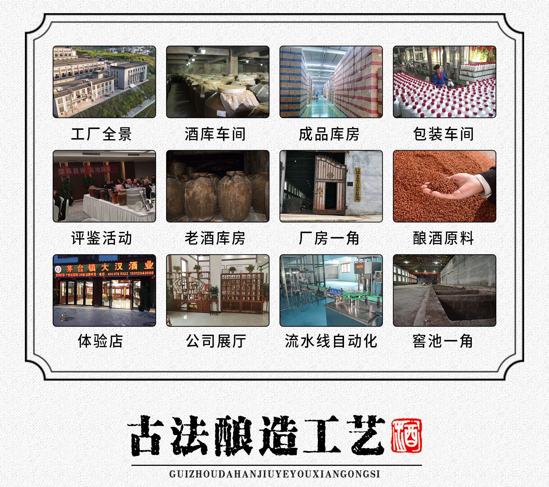 貴州省仁懷市茅臺鎮大漢酒業有限公司總部位于貴州省北部風光旖旎的赤水河畔茅臺鎮,占地面積80余畝,窖池108口,年生產優質醬香2000噸,基酒儲存萬噸,是集白酒生產、基酒儲存、產品研發、銷售代理、品牌策劃為一體的專業化酒業公司,現有員工100余人,其中國家級釀造師1人,國家級評酒師2人。 大漢酒業前身的藍氏釀酒作坊歷史悠久,源遠流長,創始人父輩是茅臺酒廠前身“成義”燒房酒師,因此,從小就耳濡目染醬香型酒的制作流程,洞悉醬香型酒制作工藝,獨享幾十年總結的獨特配方。 公司始終堅持“釀造老百姓喝得起的高品質酒”為使命,聯合20多位白酒專家,先后精心研制了“武帝御酒”系列、“酒中意酒”系列、“解悠酒”“豈無酒”系列等醬香型白酒,其中“酒中意酒”成為西藏自治區成立四十周年會議用酒。深受廣大消費者歡迎。 截至目前,大漢酒業已從基酒生產、品牌運營業務延伸到評酒培訓、個性化定制等業務,服務網絡已覆蓋全國幾十