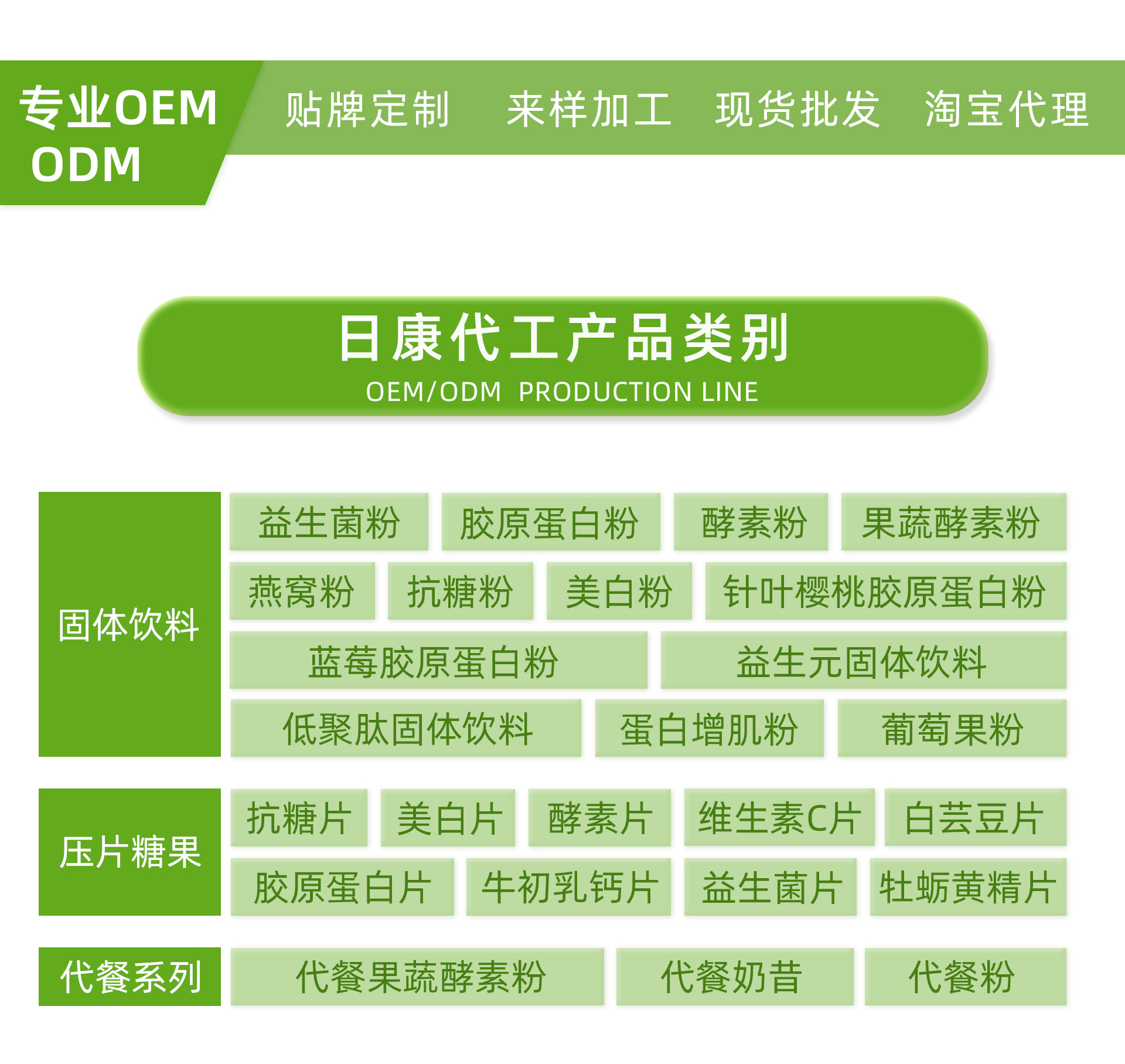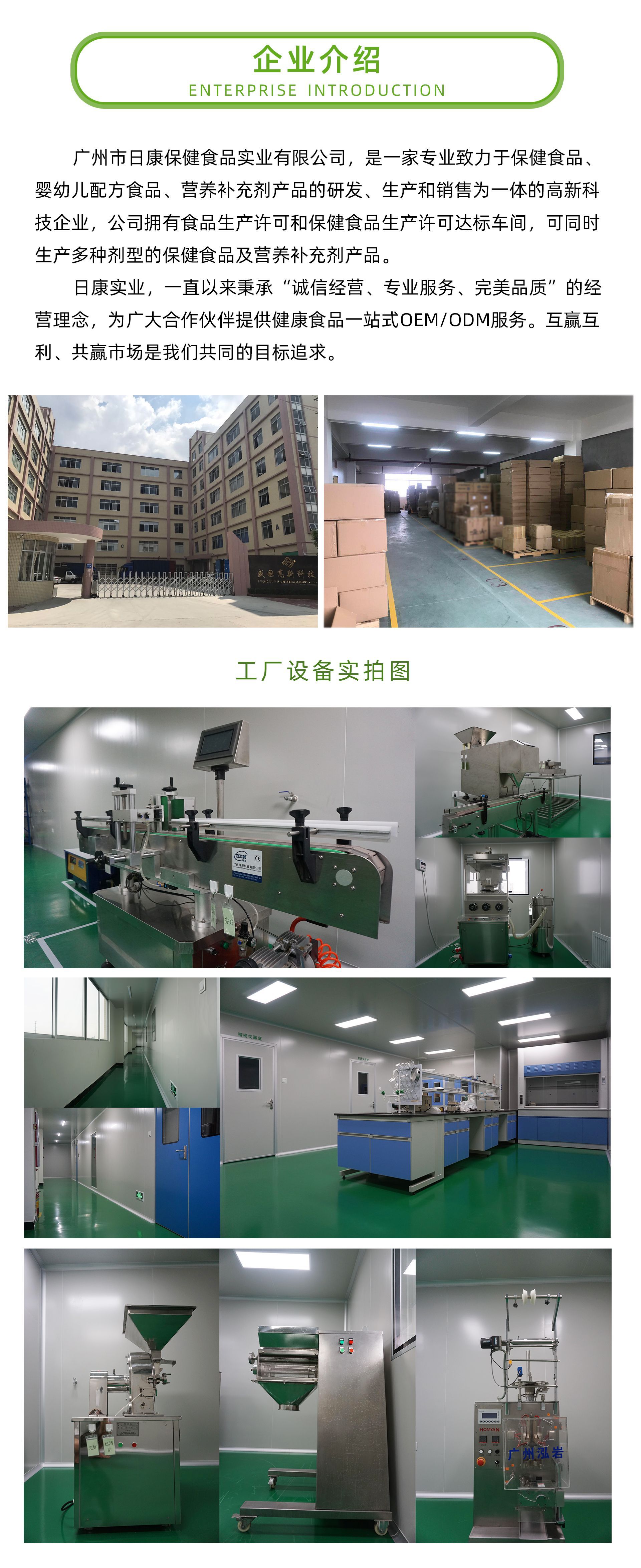 廣州市日康保健食品實業有限公司,是一家專業致力于保健食品、嬰幼兒配方食品、營養補充劑產品的研發、生產和銷售為一體的高新科技企業,公司擁有食品生產許可和保健食品生產許可達標車間,可同時生產多種劑型的保健食品及營養補充劑產品。 廣州市日康保健食品實業有限公司,專業從事片劑、粉劑、顆粒劑等各種劑型的保健食品的生產制造。生產車間實行自動化操作,配備了先進的三維混合設備、造粒設備、干燥設備、自動高速壓片機、薄膜高效包衣設備、自動顆粒機、粉末分裝機、片劑自動數粒灌裝生產線、自動貼標噴碼機等先進設備,實現優化工藝,提高生產效率,保證產品質量。