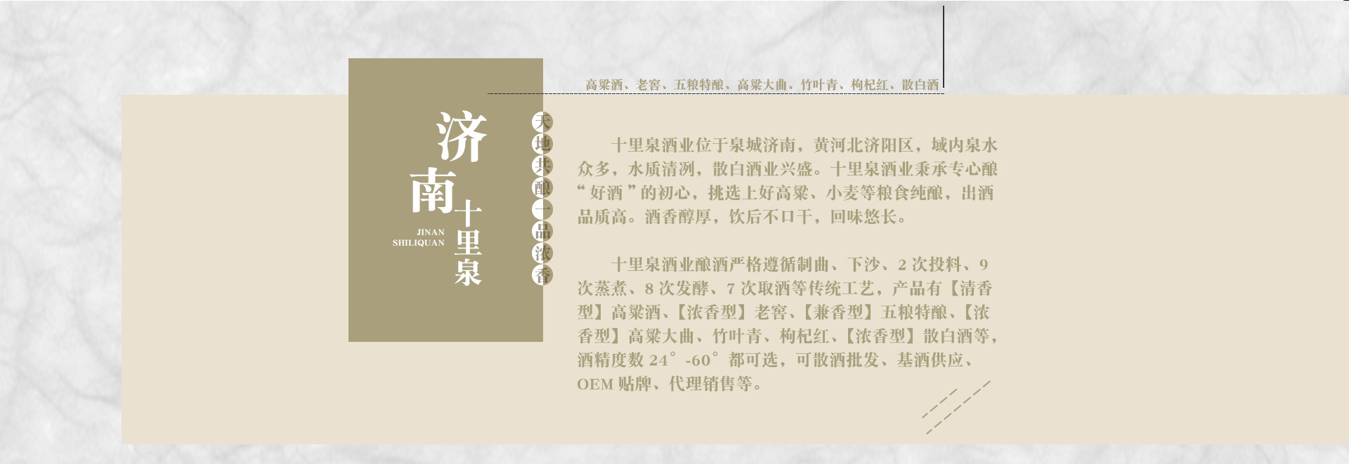 濟南十里泉酒業有限公司是散白酒-大桶酒-純糧散白酒-散白酒批發等產品專業生產加工的公司,擁有完整、科學的質量管理體系。濟南十里泉酒業有限公司的誠信、實力和產品質量獲得業界的認可,歡迎各界朋友蒞臨參觀、指導和業務洽談。