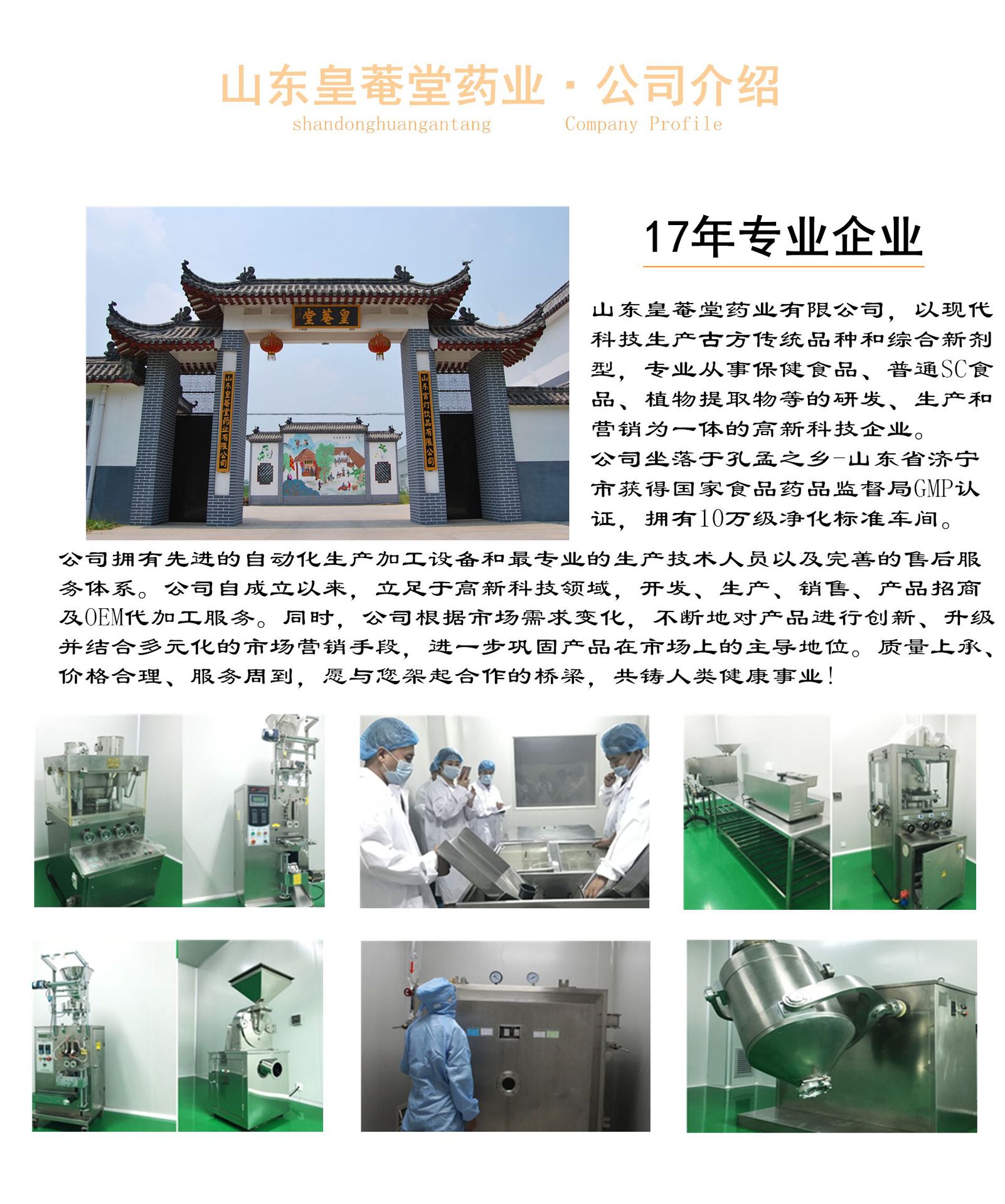 山東皇菴堂藥業(yè)有限公司是一家以現(xiàn)代科技生產(chǎn)古傳統(tǒng)品種和綜合新型劑,專業(yè)從事藥食同源食品,普通QS/SC食品,植物提取物的研發(fā),生產(chǎn),銷售和代加工為一體的高科技企業(yè)。 山東皇菴堂藥業(yè)坐落于傳統(tǒng)文化之鄉(xiāng)-曾子故里-山東省濟寧市嘉祥縣,擁有國家食品藥品監(jiān)督局GMP認證標準10萬級無菌車間,引進了先進的片劑,粉劑,顆粒劑,丸劑,膠囊劑,膏劑,口服液等機型的生產(chǎn)線,中草藥的提取濃縮生產(chǎn)線,擁有先進的自動化生產(chǎn)加工設(shè)備和最專業(yè)的生產(chǎn)技術(shù)人員以及完善的售后服務(wù)體系。 同時,公司根據(jù)市場需求變化,不斷地對產(chǎn)品進行創(chuàng)新、升級,并結(jié)合多元化的市場營銷手段,進一步鞏固產(chǎn)品在市場上的主導(dǎo)地位。質(zhì)量上承、價格合理、服務(wù)周到,愿與您架起合作的橋梁,共鑄人類健康事業(yè)!