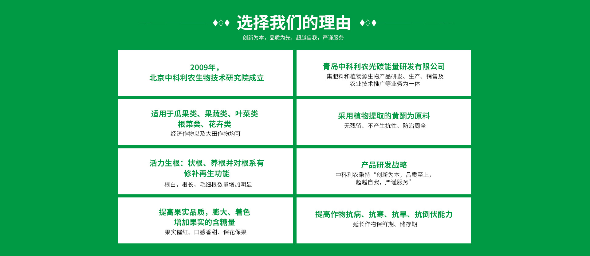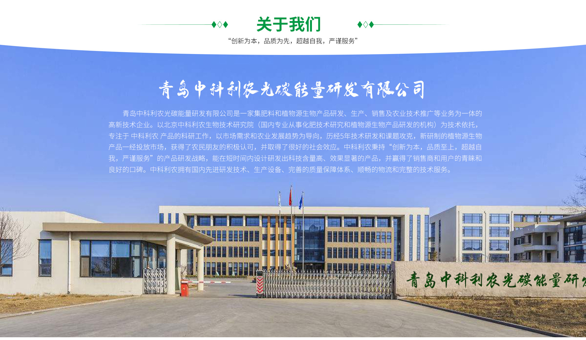 青島中科利農光碳能量研發有限公司是一家集肥料和植物源生物產品研發、生產、銷售及農業技術推廣等業務為一體的高新技術企業。以北京中科利農生物技術研究院(國內專業從事化肥技術研究和植物源生物產品研發的機構)為技術依托,專注于 中科利農 產品的科研工作,以市場需求和農業發展趨勢為導向,歷經5年技術研發和課題攻克,新研制的植物源生物產品一經投放市場,獲得了農民朋友的積極認可,并取得了很好的社會效應。 中科利農秉持“創新為本,品質至上,超越自我,嚴謹服務”的產品研發戰略,能在短時間內設計研發出科技含量高、效果顯著的產品,并贏得了銷售商和用戶的青睞和良好的口碑。 中科利農擁有國內先進研發技術、生產設備、完善的質量保障體系、順暢的物流和完整的技術服務。