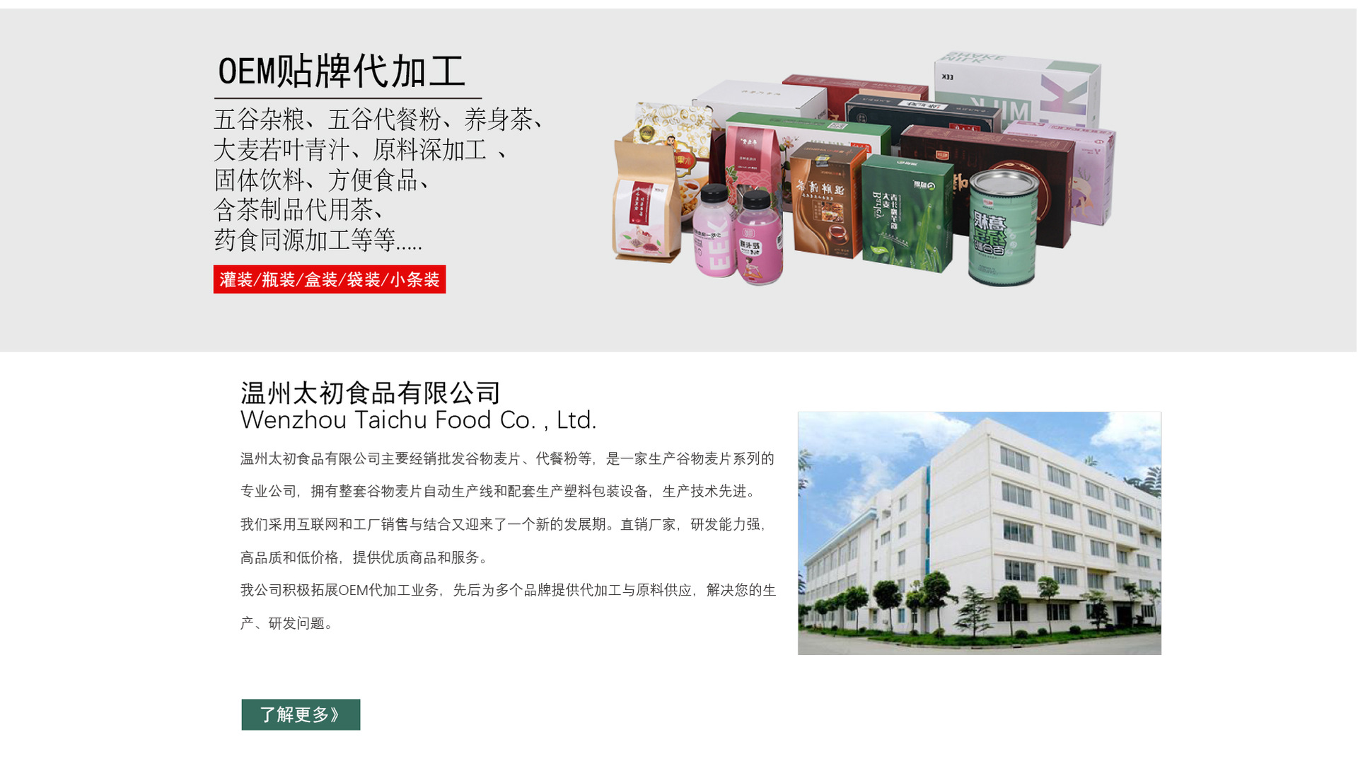 溫州太初食品有限公司位于美麗的山海蒼南縣靈溪鎮鹵制品工業園,成立于2015年5月12日,注冊資本100萬元,廠房面積共1600平方米 (其中生產廠房800平方米,庫房400平方米,化驗室30平方米,辦公和生活用房300平方米)。擁有ppt瓶自動灌裝流水線線一條,WFJ-20型微粉碎機一臺,WYS-100型微波烘干機一臺,小型粉末包裝機10臺, 其他機械設備28臺?;炇以O備齊全,檢查手段完善。是一家長期從事五谷雜糧粉、水果堅果燕麥片、代用茶、奶昔代餐粉等 代餐谷物制造OEM專業生產廠家。自公司成立以來一直致力于代餐谷物的研發,先后為多家企業合作。