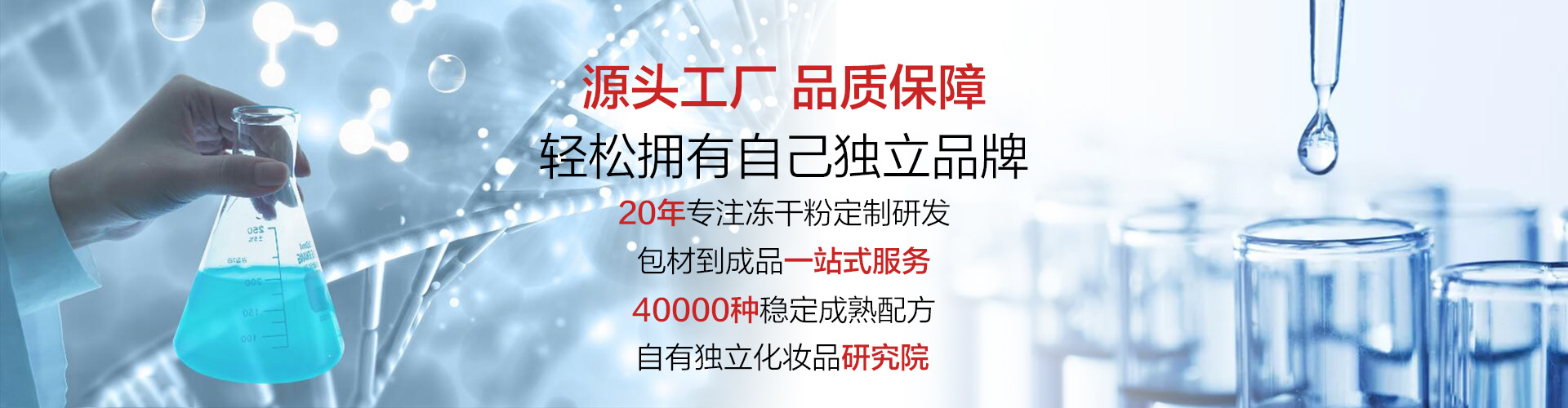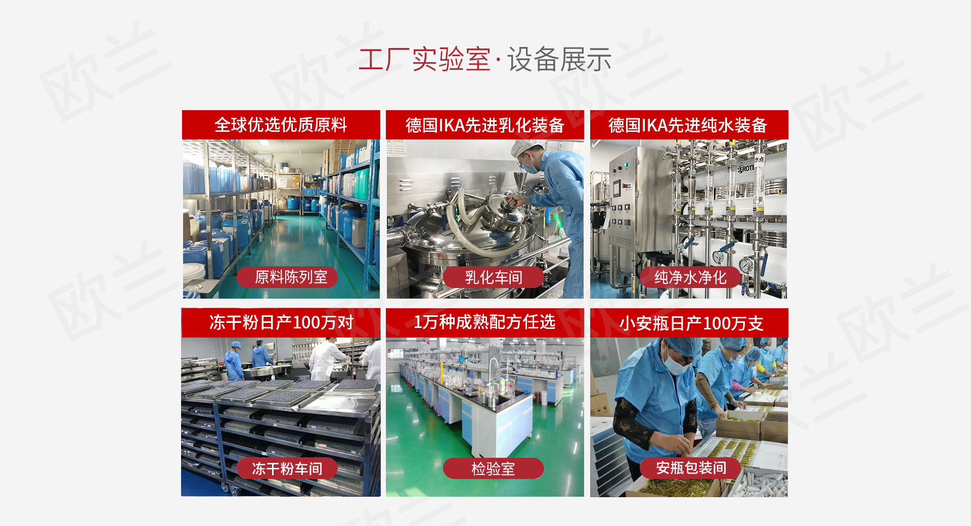 廣州歐蘭化妝品有限公司是一家專業生產凍干粉,安瓶精華,果凍杯,水乳膏霜套盒,面膜,OEM/ODM企業,集研發、服務于一體。化妝品研究開發的!新廠創建于2017年,座落在中國廣州市白云區神山大道西369號建筑面積10000平方米。廠房按照現代化ISO9001標準設計,布局合理,環境優美,生產車間寬敞明亮,配備全套的乳化攪拌、灌裝等先進的生產設備和檢測儀器。多年來已與新加坡、馬來西亞、香港、臺灣等東南亞國家和地區及國內眾多化妝品公司建立了良好的合作關系,創立了多個有影響力的品牌。我公司有著得天獨厚的技術后盾——與軍醫大學有著長期的緊密合作關系,公司經理、總工程師、技術骨干均為軍醫大學或精細化工系畢業。使我公司從產品的設計、配方的制定、原料的選取到廠房的布局、生產過程工藝的保證、產品的成本等都能一直處于行業的領先地位,保證了我公司生產的產品科技含量高,質量可靠、成本低廉。由于公司在技術水平上不斷